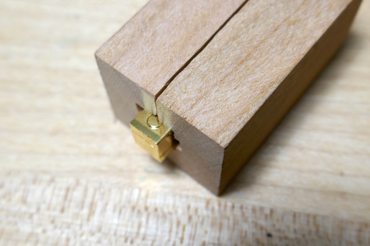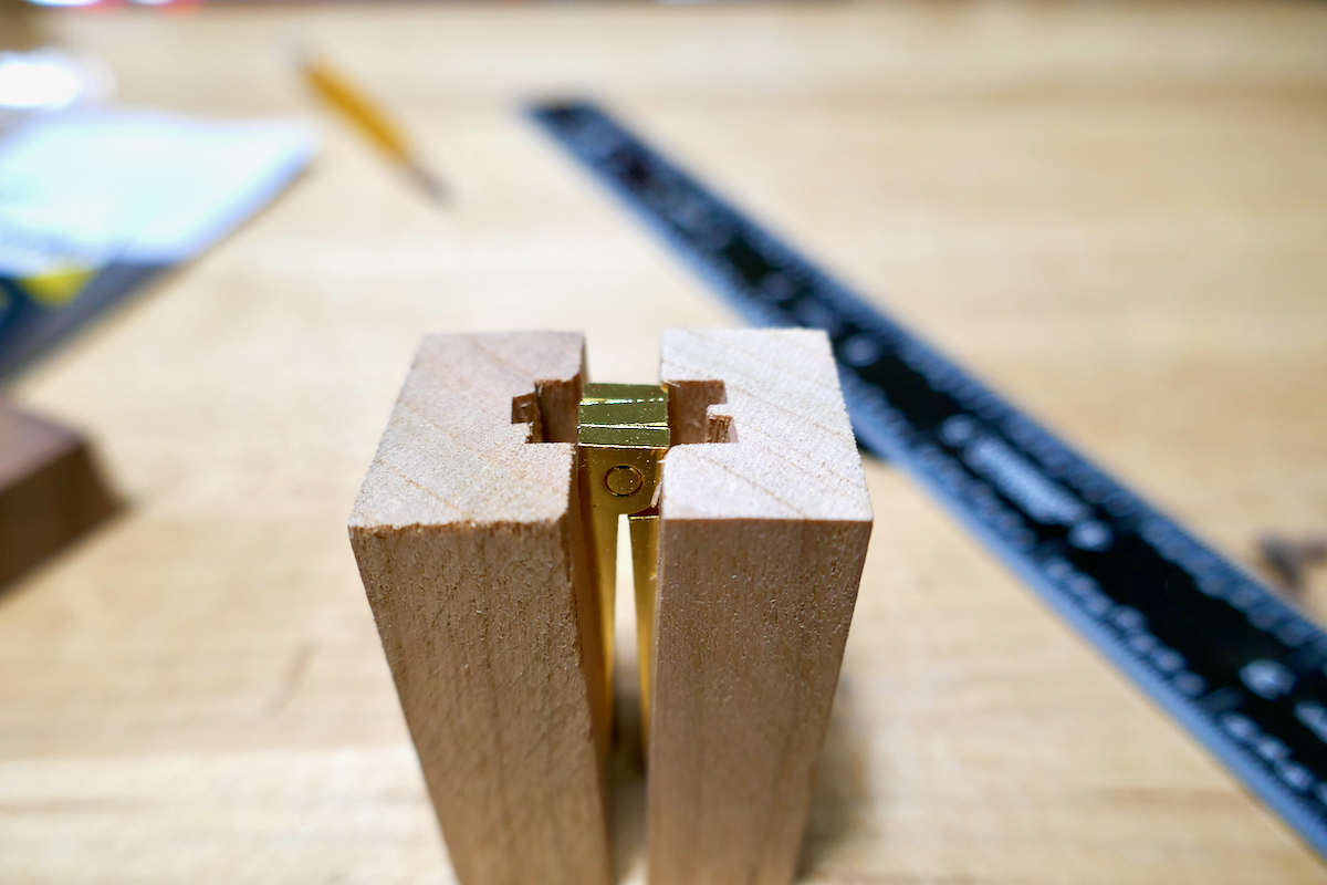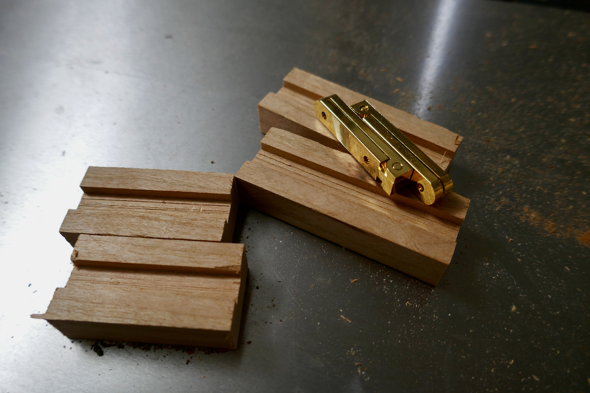 To test the hinge and decide on the best installation location, I created a mockup. I grooved a piece of wood on the table saw and cut it to produce two short parts which nest the hinge’s leaves.