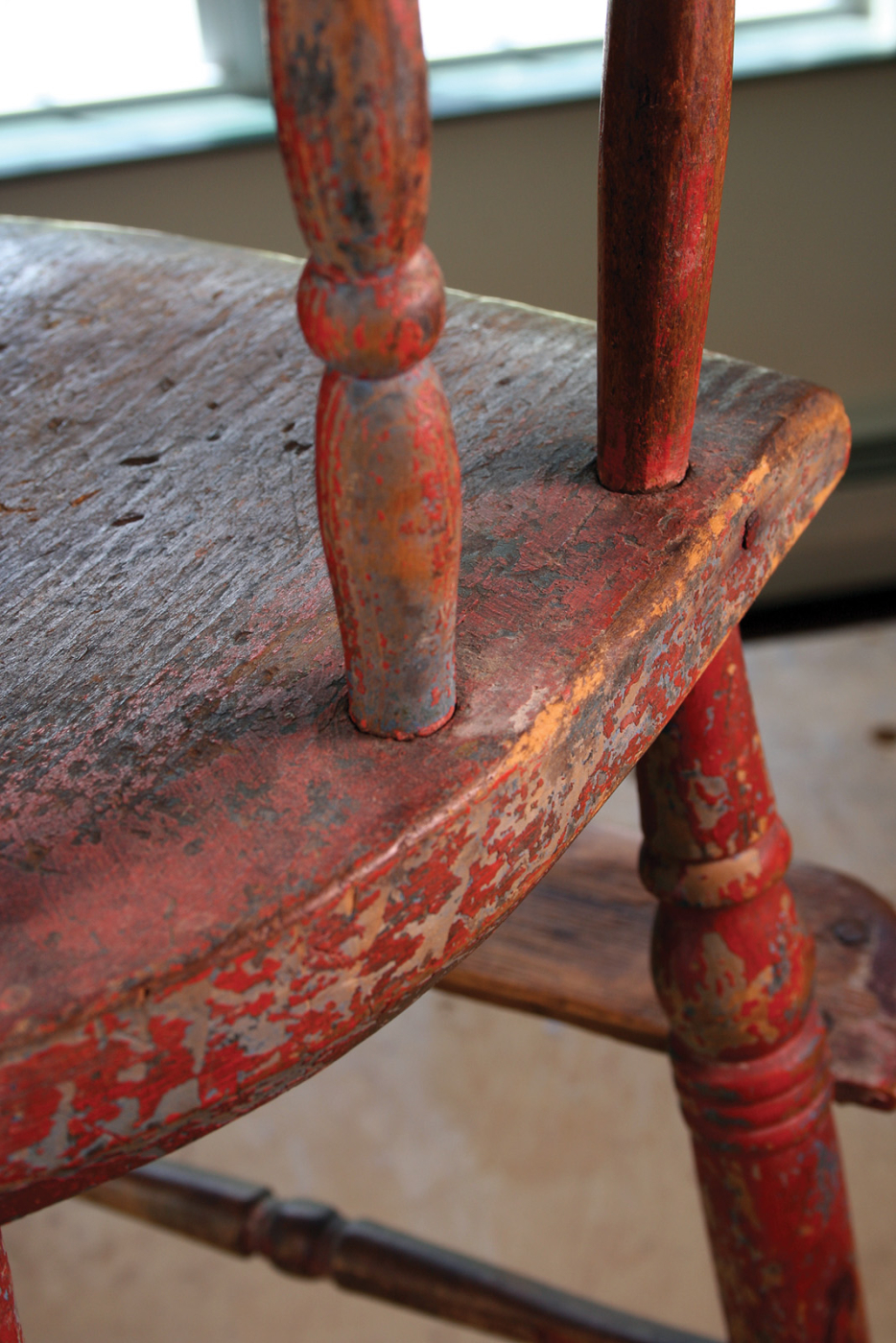 Long-term storage has other results. In the northeast, unheated attics become a freezer in the winter and an oven in the summer. Extremes in temperatures affect furniture adversely. In an attic, wood moves more than it does in a less extreme environment. In time, finishes – both paint and clear – begin to crawl and break up into a pattern like alligator skin. They also flake and loosen. In the antique world this chipped and dried-out look is called an “attic finish.” Many Windsor chairmakers are skilled at simulating an attic finish with milk paint.
