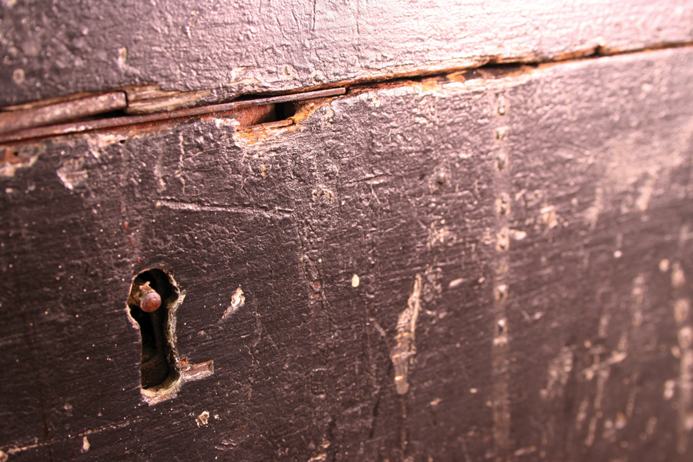 No key? No problem. This chest was pried open with a screwdriver at some time during its life – a common form of damage.