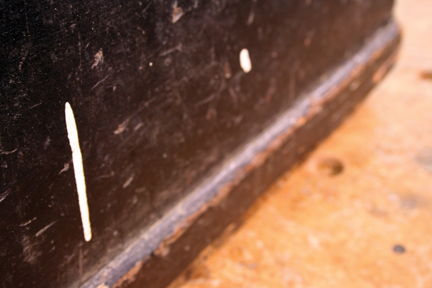 Scarred for life. Someone used this chest as a sawhorse, leaving a permanent mark on the lid and side.