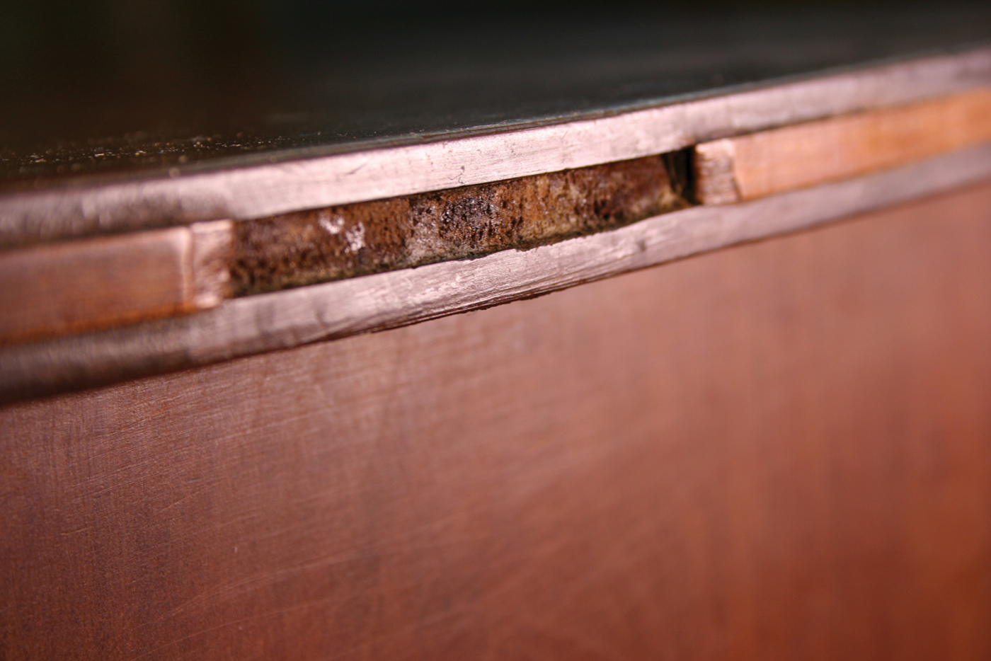 The temperature in a cellar remains more stable, but being below ground, basements are humid – especially in the summer. The wood swells. The moisture attacks water-soluble animal glues, and joints loosen. Veneers lift off and inlay falls out. Finishes lose their bond. Sometimes finishes loosen so much that they can be brushed away like dirt.