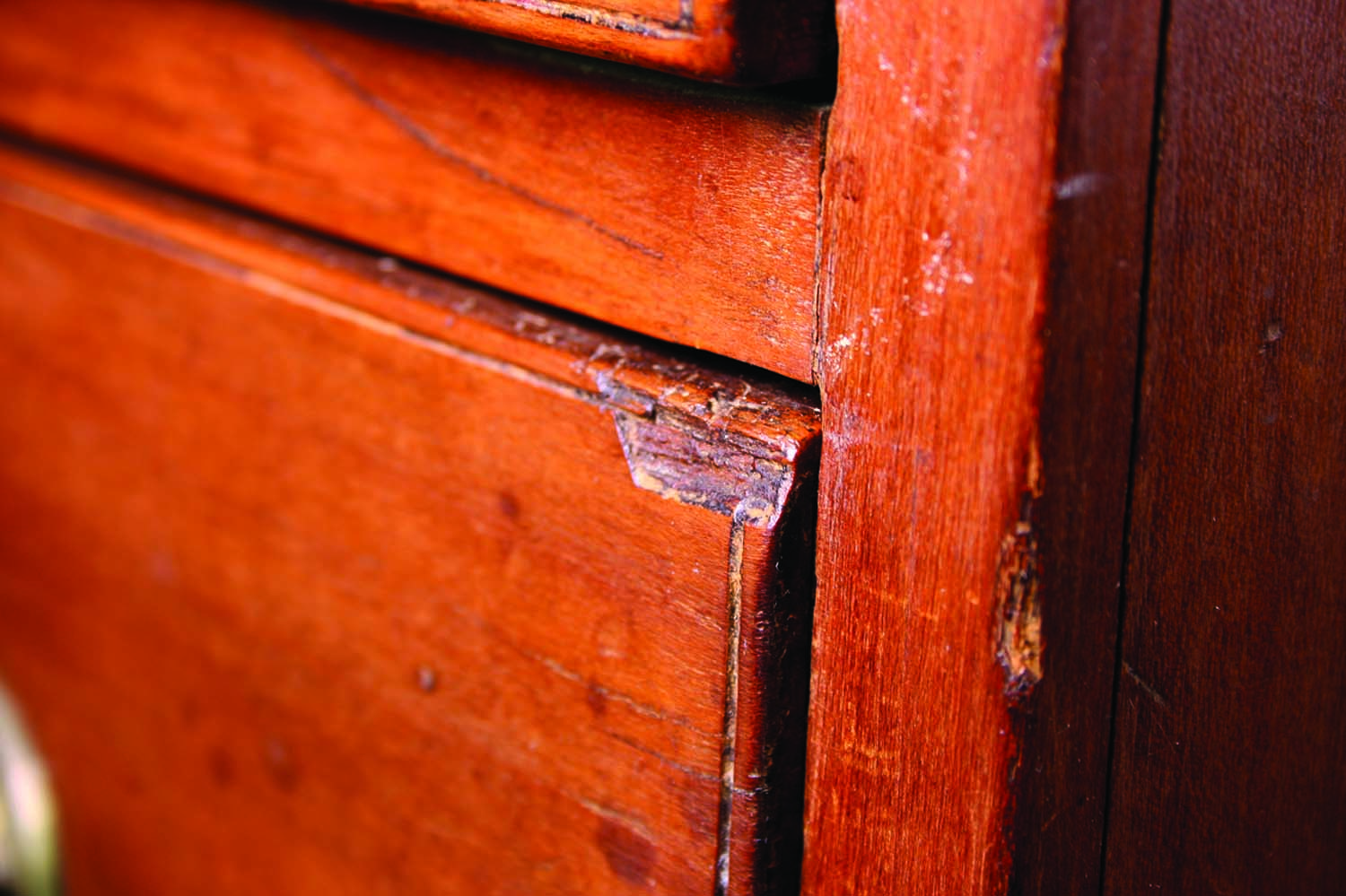 Busted. The corners of drawers are vulnerable, and it is common to see their edges chipped out like this.