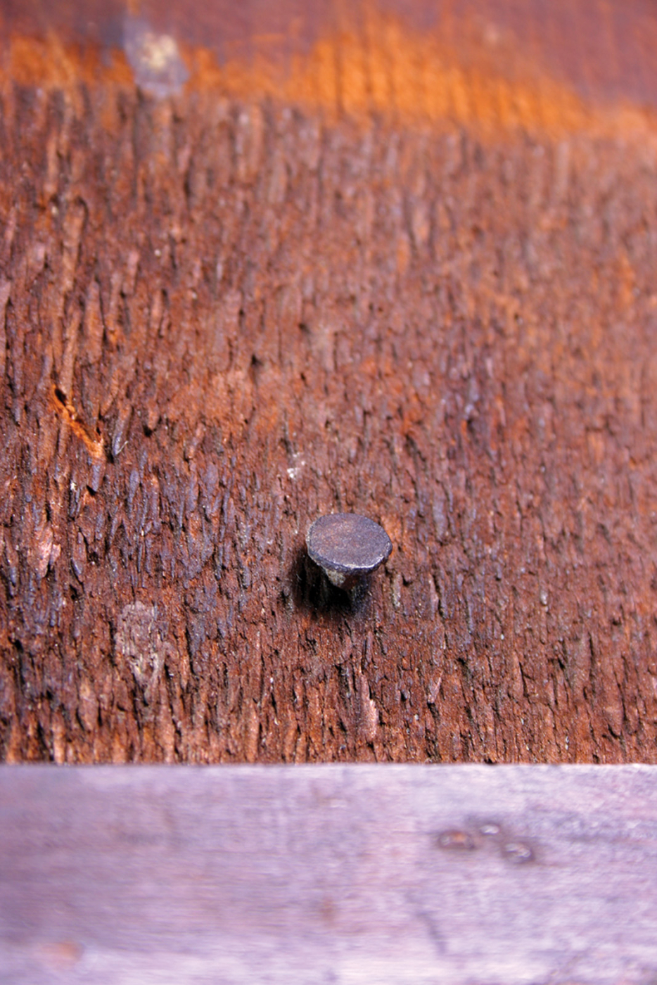 Wrong nail. Wire nails, which have a round shank and a round head, were invented in the 19th century and have no place on an early piece such as this – unless they were added to repair a piece.
