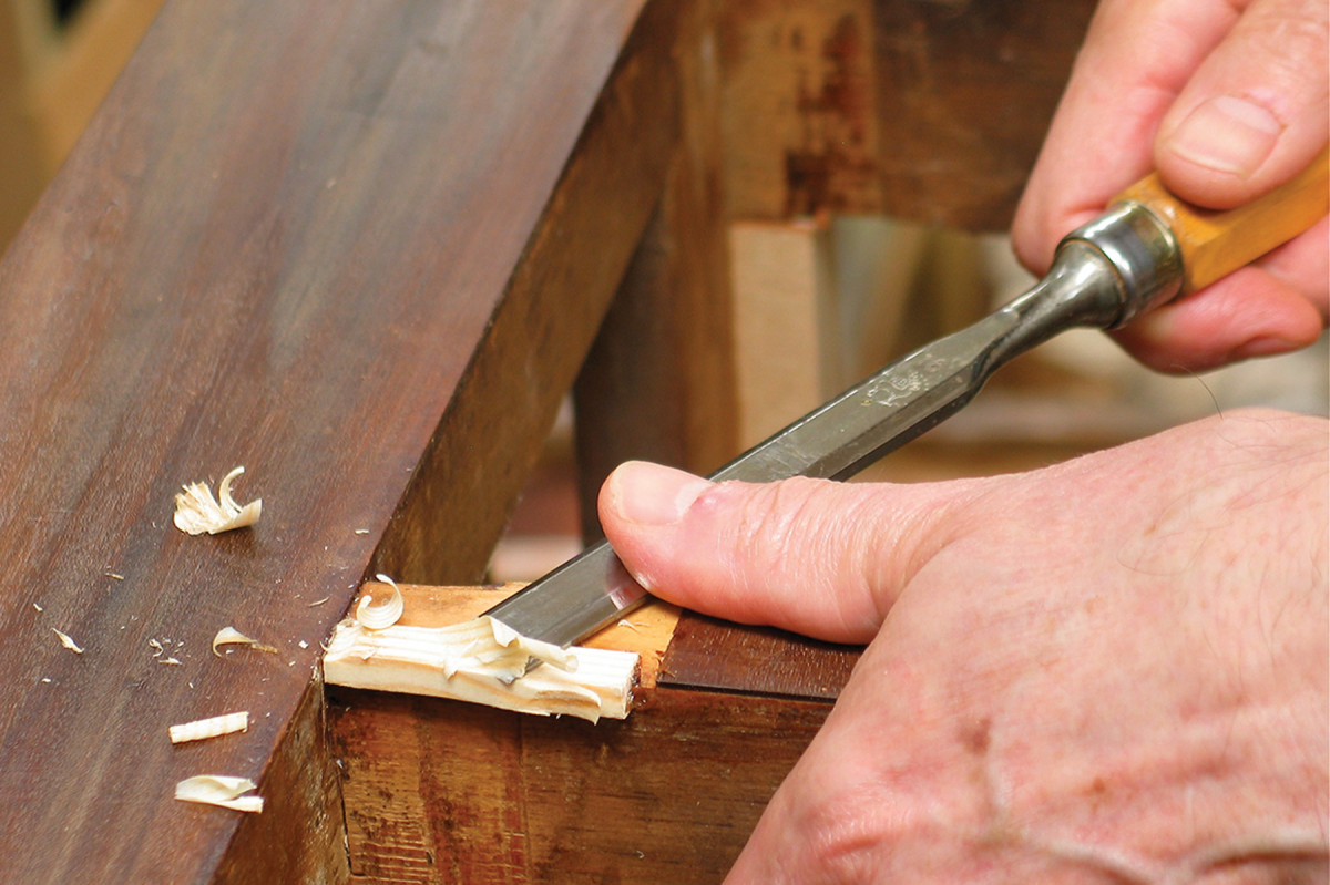 Trim the veneer. Because the veneer used on this chest-of-drawers was considerably thicker than modern veneer, I used solid wood for the patches. Then I trimmed each patch level with a handplane.