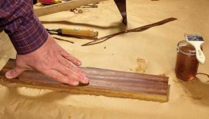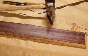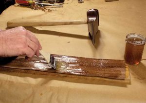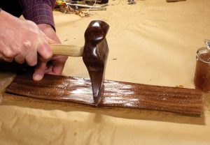 In hammer veneering the critical process involves quickly slathering on a comparatively thick layer of molten glue to the underside of the veneer and to the top side of the substrate, placing the two in contact with each other, and “laying down” the veneer by pressing the cross peen of the hammer over the surface with considerable force. (Some “back of the envelope” calculations indicate that when I hammer veneer, the downward force of the hammer edge approaches 500 pounds per square inch.)