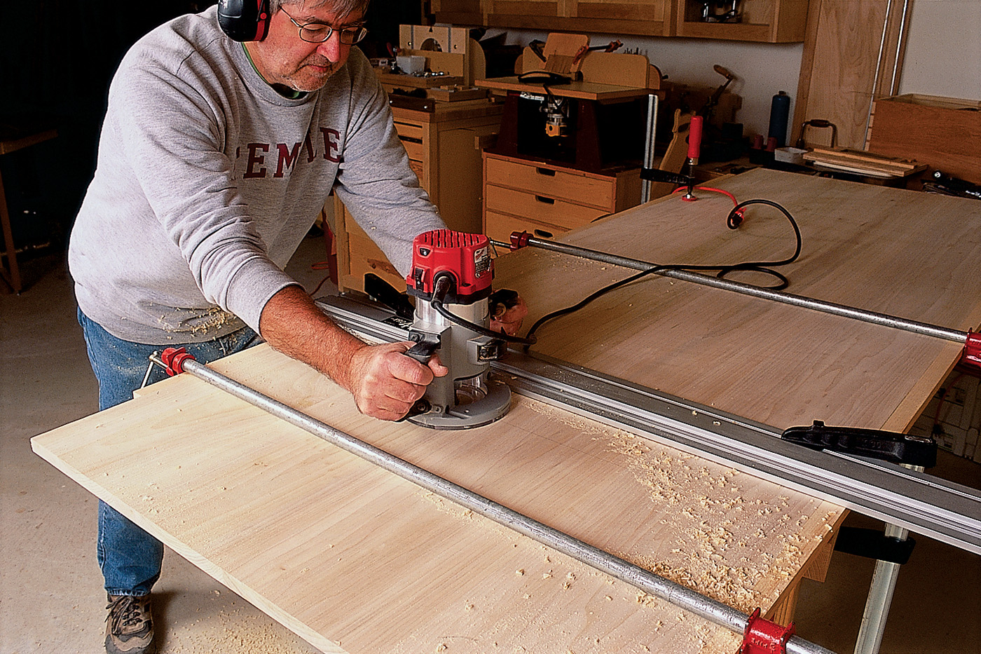 The dovetail slot must be cut with the bit set to final depth. Clamp scrap to each edge of the tabletop to prevent tearing out the top’s edges. Make sure your guide is straight and rigid, perpendicular to the tabletop edges, and securely clamped.