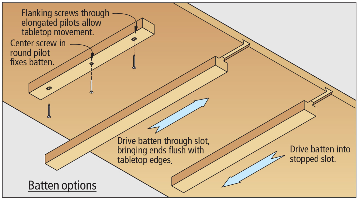 The drawing above shows two basic options: Attach each batten with three screws or with a sliding dovetail. No glue is used. The obvious advantage of using fasteners is that you can cut and mount each batten quickly. In addition, a batten secured with screws can be relatively unobtrusive; cut it 3″ or 4″ shorter than the table’s width so it can be set back from the table’s edges.