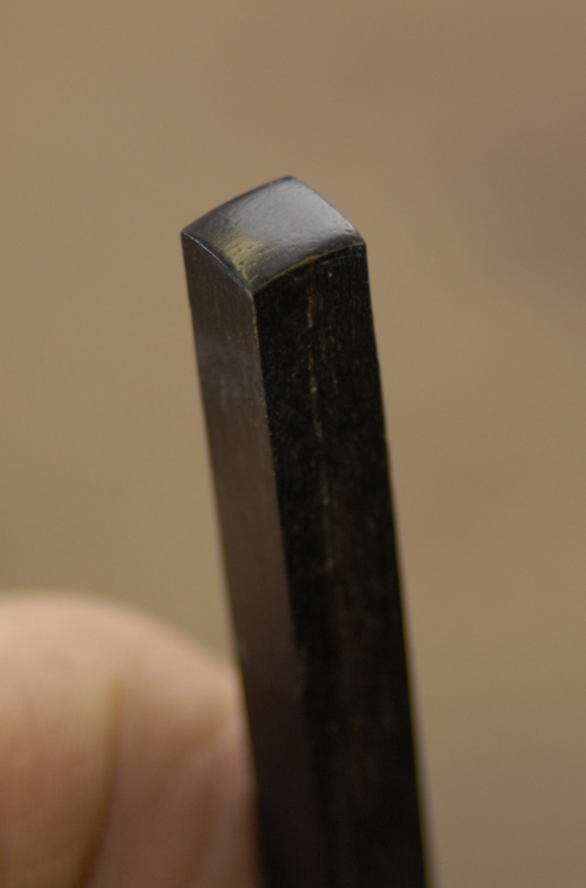 1. Start with a long rod of ebony that is cut a light 1/64” (about 10 thousandths) over the given plug size. The end of the rod should be square.