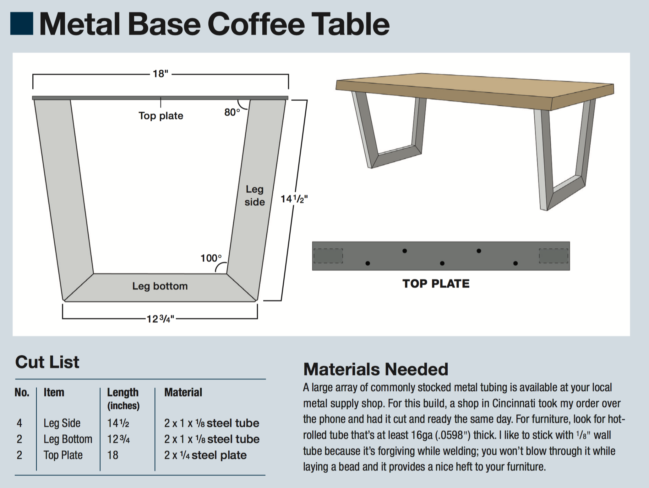 Materials Needed A large array of commonly stocked metal tubing is available at your local metal supply shop. For this build, a shop in Cincinnati took my order over the phone and had it cut and ready the same day. For furniture, look for hot- rolled tube that’s at least 16ga (.0598″) thick. I like to stick with 1/8″ wall tube because it’s forgiving while welding; you won’t blow through it while laying a bead and it provides a nice heft to your furniture.