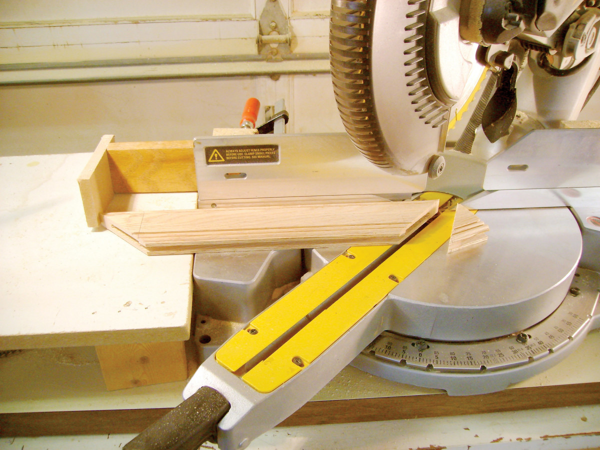 6. Cut miters on the ends of the rails (Photo 5). This is a finicky cut, so it’s best to creep up on it by gradually readjusting the position of a stop block. The idea is to miter the corners of the rails without making the rails any shorter, tip to tip.