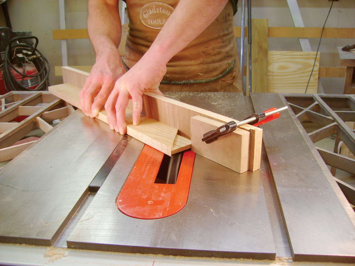 8. Set up your miter gauge to cut the actual tenons (Photo 8). Again, start with a test piece. Swivel the miter gauge to 45°, either way. Fasten a fence to the miter gauge and clamp a stop block to the end of the fence. The exact position of the block will require some fine-tuning. Use a test piece that’s the same width as your stiles and rails. Position the stop block so that your dado set cuts right to the tip of the test piece. Once the stop is positioned, cut the stiles. This requires more than one pass. Start with the stile pulled away from the stop, then make a series of overlapping cuts. Cut both ends of each stile this way.