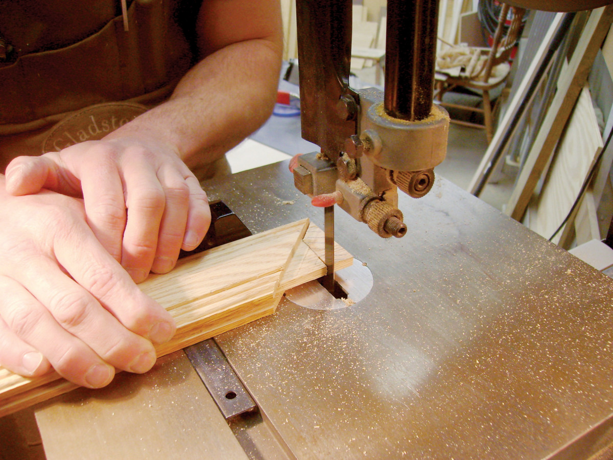 10. Cut the tenons to length. First, set a combination square to the distance from the edge of a stile to the bottom of a mortise (Photo 10). Extend the square’s blade another 1/32″ or so for clearance, then mark this distance on all the tenons. Saw the waste on a bandsaw or by using a handsaw (Photo 11). When sawing the mitered portion, stay 1/32″ or so away from the shoulders. Pare this cut with a chisel (Photo 12), and the joint is complete.