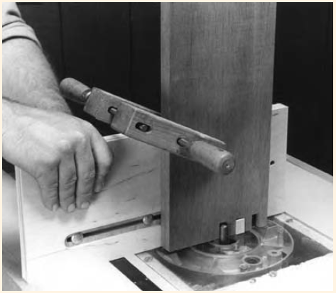 To use the jig, screw or bolt the mount to a miter gauge. Loosen the wing nuts that secure the face to the mount and slide the face sideways until the stop is the proper distance away from the bit. When the stop is positioned properly, tighten the wing nuts.