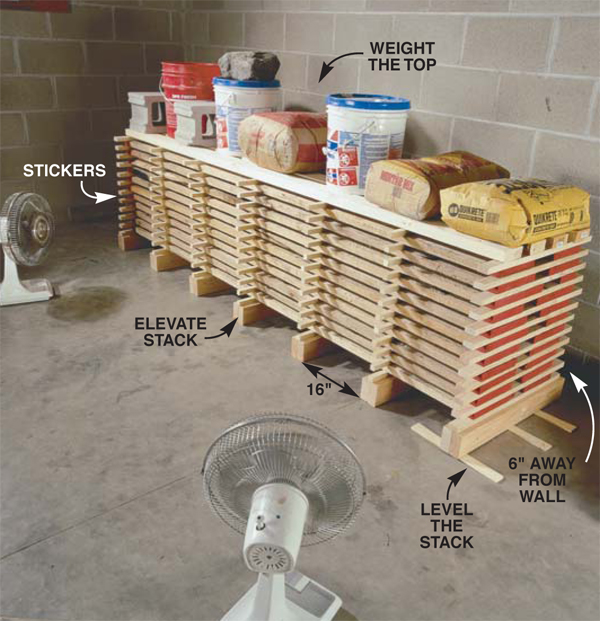 You can air-dry 4/4 lumber indoors from 15 percent to 8 percent in a single heating season. Remember, you don’t have to bring in the whole stack at once. Just bring in enough to satisfy your needs for the coming year. I’ve had small stacks of wood drying in the attic, the basement and the garage. (In my experience, don’t even think about the living room!)