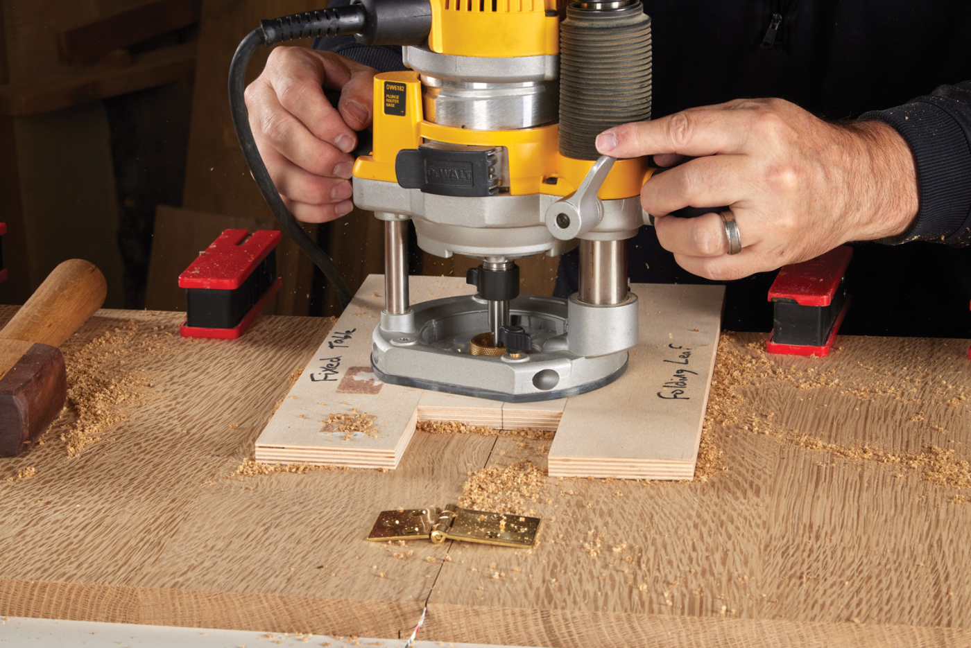 use thin cardboard (dense, non-corrugated packaging cardboard) as a spacer. Usually, one or two strips create a sufficient gap between the panels of your table. Aim for a 1/32“ gap between panels when routing the hinge mortise. Chuck a hinge-mortising bit into a compact plunge router. Make sure the bearing on the bit exactly matches the cutting diameter. Some hinge mortising bits have slightly oversized bearings, which is problematic when it comes time to install the hinges. In addition, source a bit with a short cutting length. A 1/4“ or 5/16“ cutting length will work fine with the template you made. Secure the template with double-sided carpet tape, aligning the pencil mark on the template with the joint line of your table. Set the router bit depth to the thickness of the hinge leaf, plus the thickness of your template material. Rout around the hinge template in a clockwise direction, then clean out the waste in the middle of the opening.