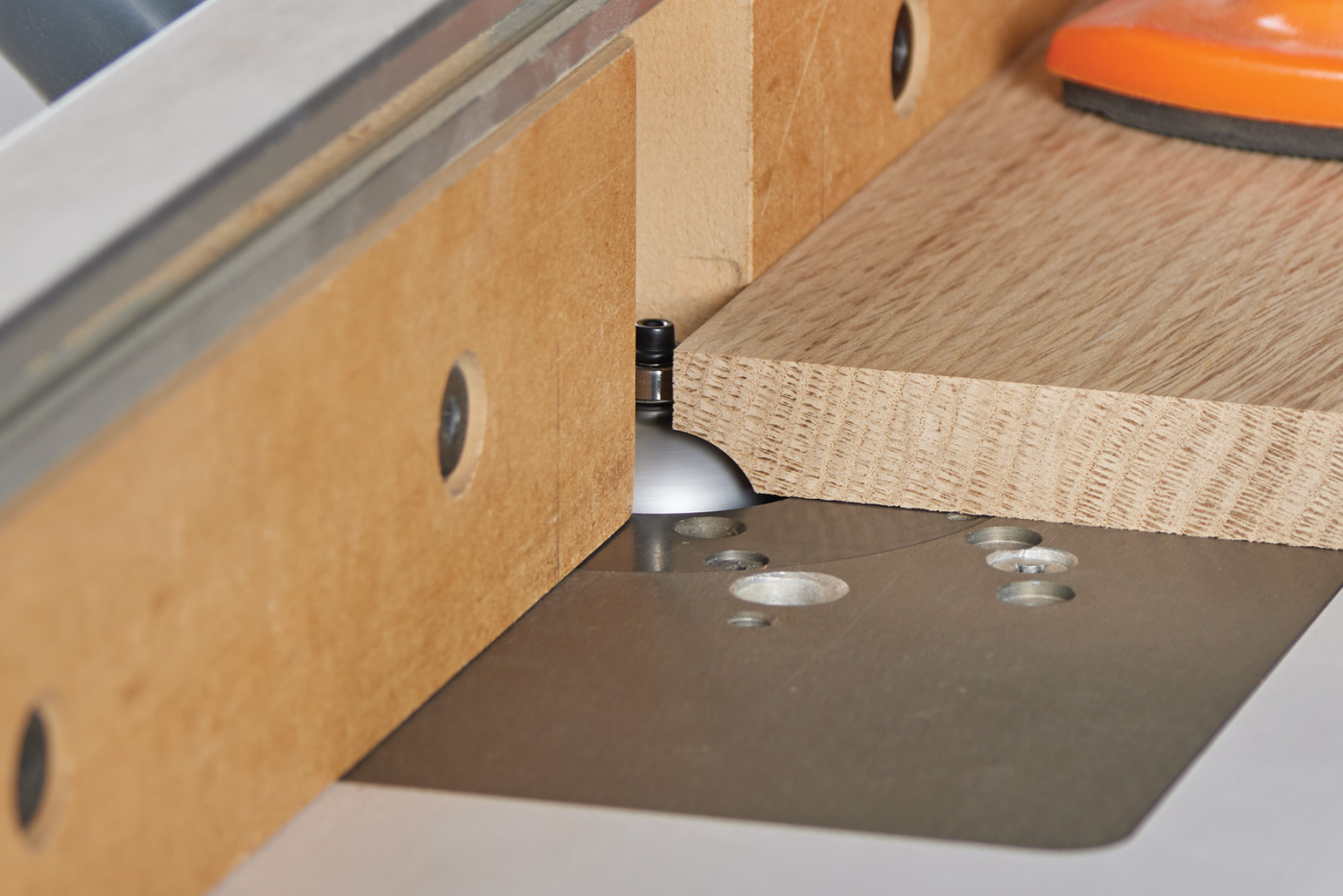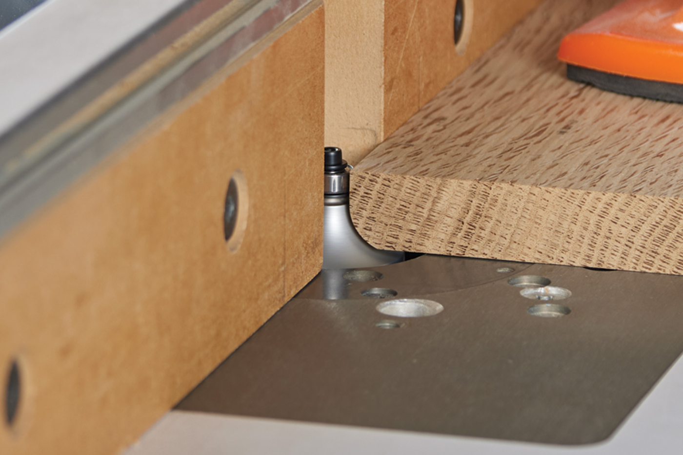 The table top receives a shouldered roundover. To cut this, I make multiple passes at the router table, raising the bit a little each time.