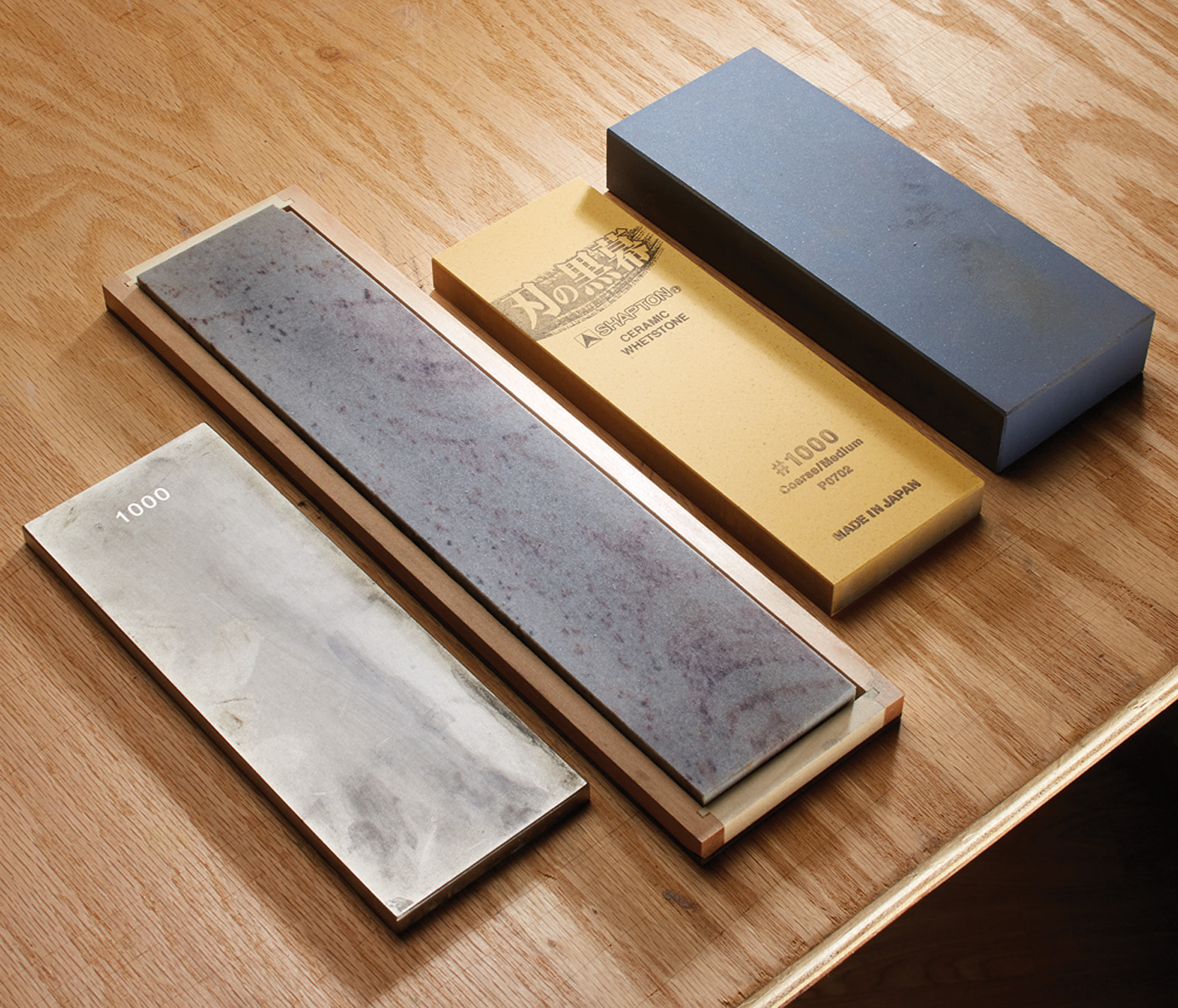 Hone. From front to back are pictured a #1,000-grit diamond stone, a soft Arkansas oilstone, a #1,000-grit no-soak waterstone and a #1,000-grit Japanese waterstone.