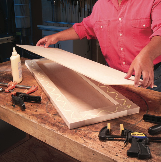 Sandwich construction uses readily available thicknesses of plywood to create thicker panels. It also lets you produce a panel that has two very good-looking sides because the best side of each piece of plywood faces outward. There are two basic ways to create a sandwich panel. The first is to simply glue two pieces of plywood back to back. This is the approach we used for the end panels in this bookcase shown here.
