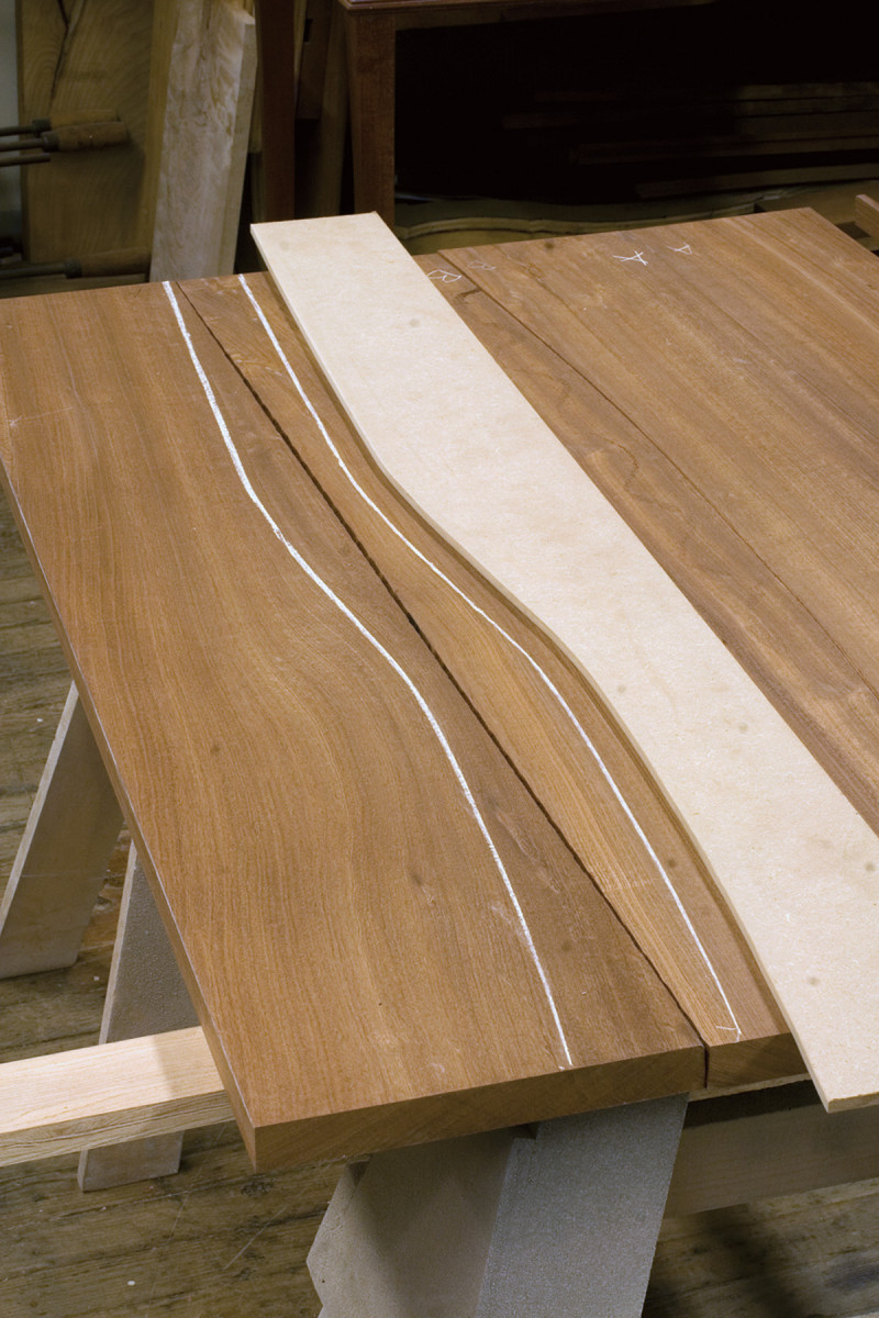 On a 1⁄4“-thick piece of MDF, draw an outline that roughly follows the grain patterns. Cut the outline on the band saw and shape it to a smooth curve. Now place this master pattern onto the board, running with the grain. Adjust its outline to better follow the grain direction.