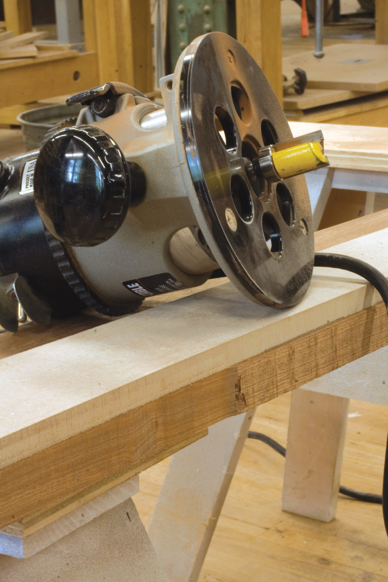 When setting up the router, extend the bit to clear the full thickness of your material. Any adjustment to the router bit after you make a cut might produce a stepped edge. The first pass should be light, taking away about half of the waste. The next pass should remove the rest and leave a perfectly smooth edge ready for gluing.
