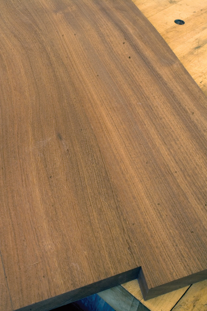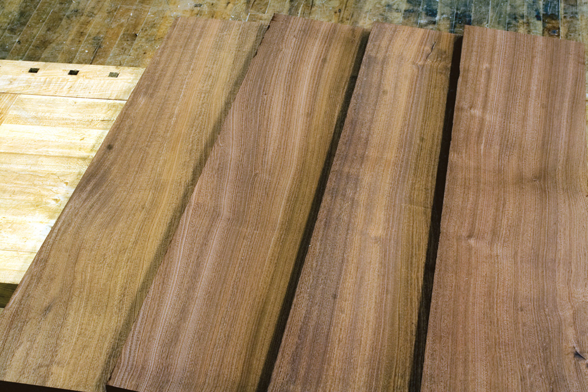 I start out by laying the boards alongside one another and turn them over and end-for-end to obtain the most pleasing arrangement. I look for color, similar grain and grain direction. Once I’ve decided on the order and position of the boards, I look for surface patterns that complement one another. The flatter the curves, the better.