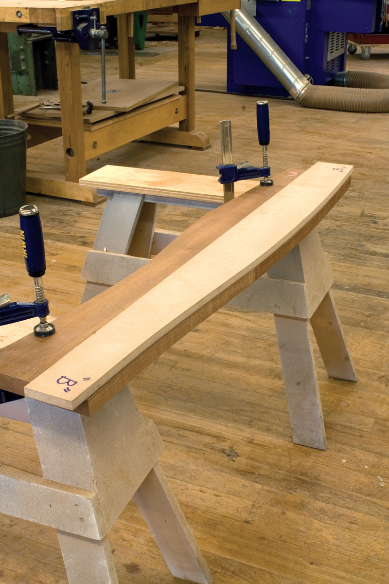 Careful clamping. Rubber-padded cauls are used to prevent clamp marks on routed edges.
