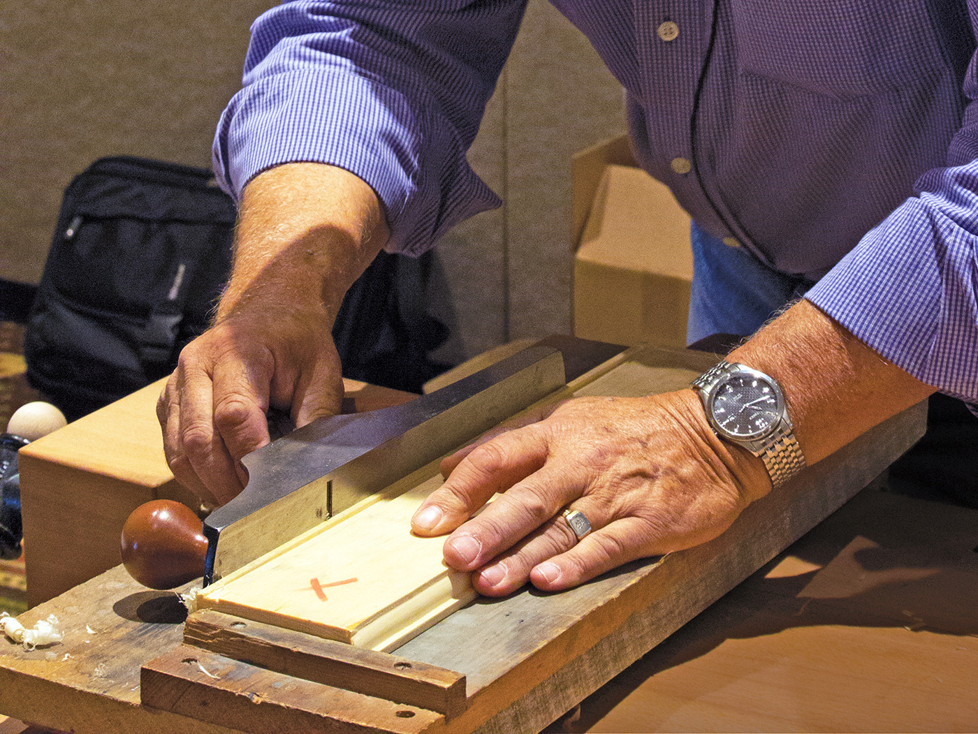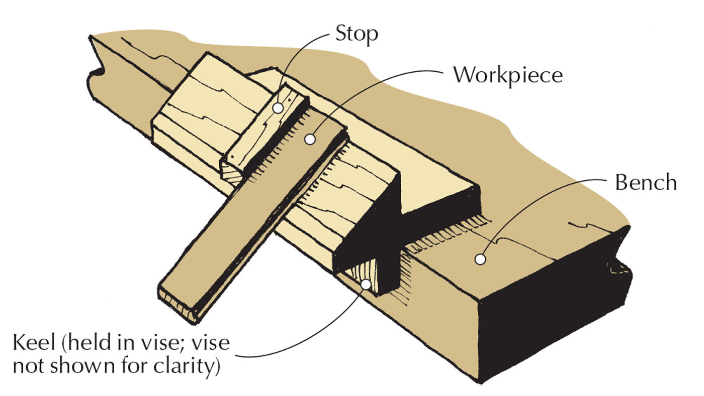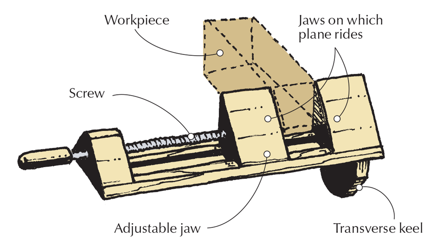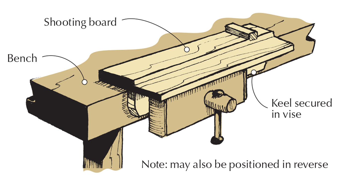 Keel. A keel attached on the underside of the shooting board can be secured in a vise.