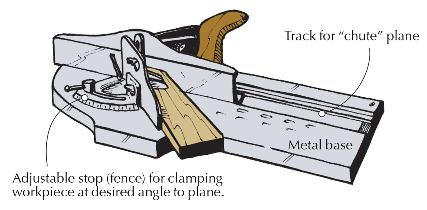 Fence. If you don’t have a shooting board of sufficient size to hold the work, attach a fence to the plane to hold it at the desired angle.