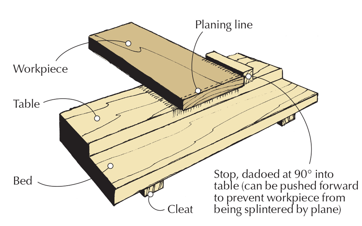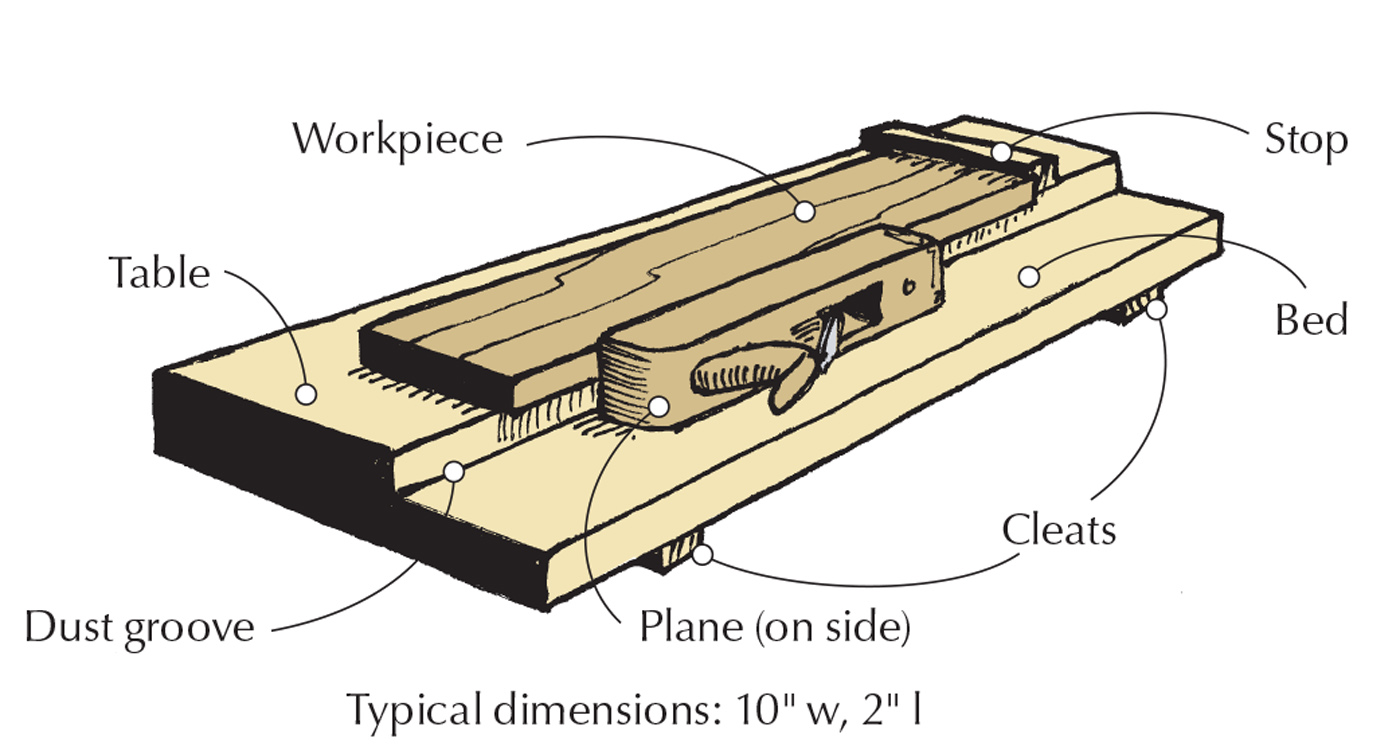 The simplest form of shooting board consists of three pieces: a base on which the plane runs on its side; a table where the workpiece rests to raise it so the plane’s iron engages the workpiece’s entire edge; and a stop fixed to the table against which the workpiece is held.