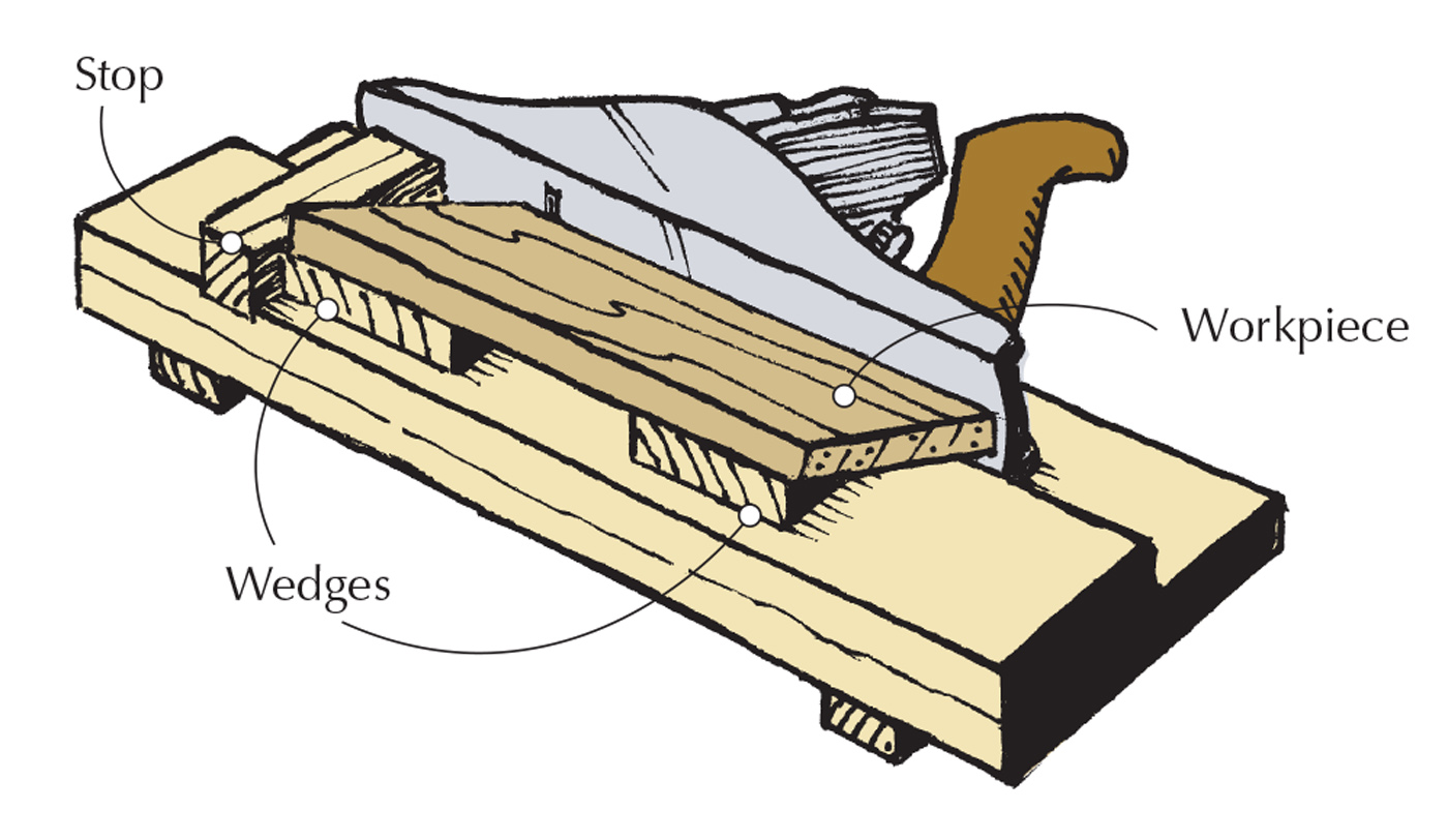 Off 90°. A basic shooting board can be used to plane edges at angles other than 90°; simply insert wedges of the needed angle under your workpiece.