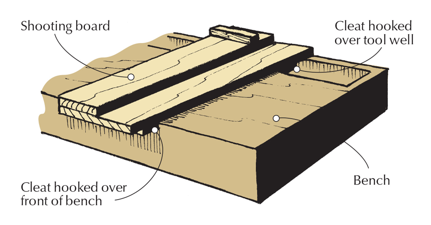 Cleats. A cleat at the near end acts as a bench hook; a second cleat, at the far end, drops into the tool well. (You could skip the far cleat if you build the shooting board from a stable materials, such as plywood.)