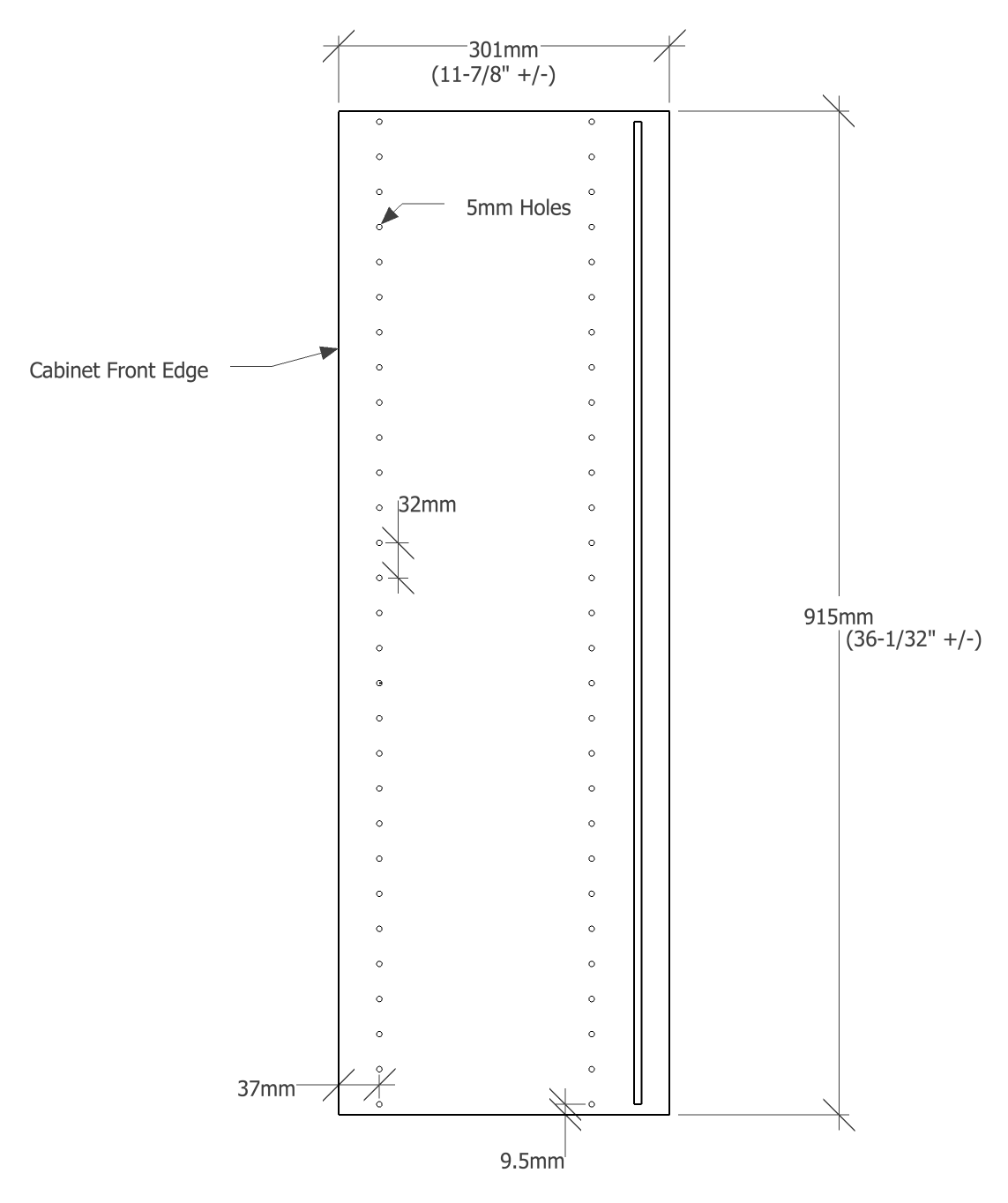 4. Space adjustable shelf holes 32mm apart, and make the first row of holes 37mm from the cabinet’s front edge