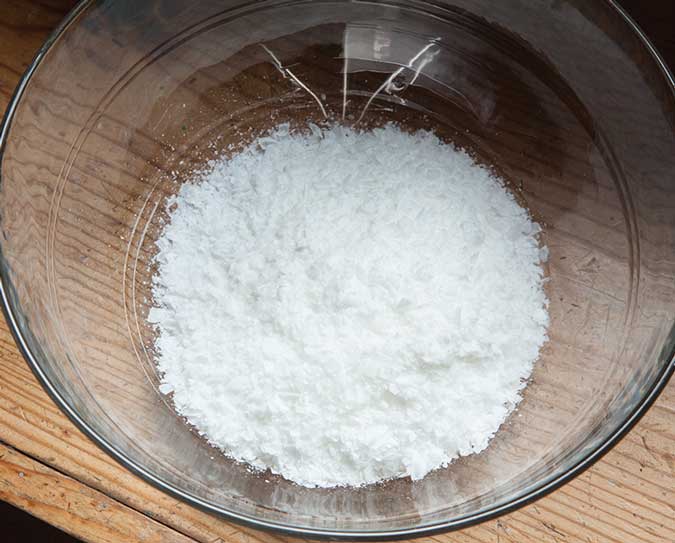 If you mix these flakes with hot water you will produce a solution that is somewhere between whipping cream and a soft wax in consistency. The trick is deciding how much water to add to how much soap.