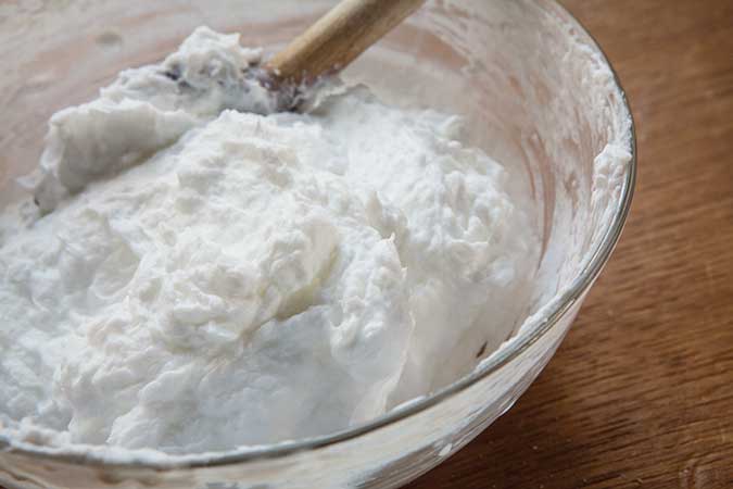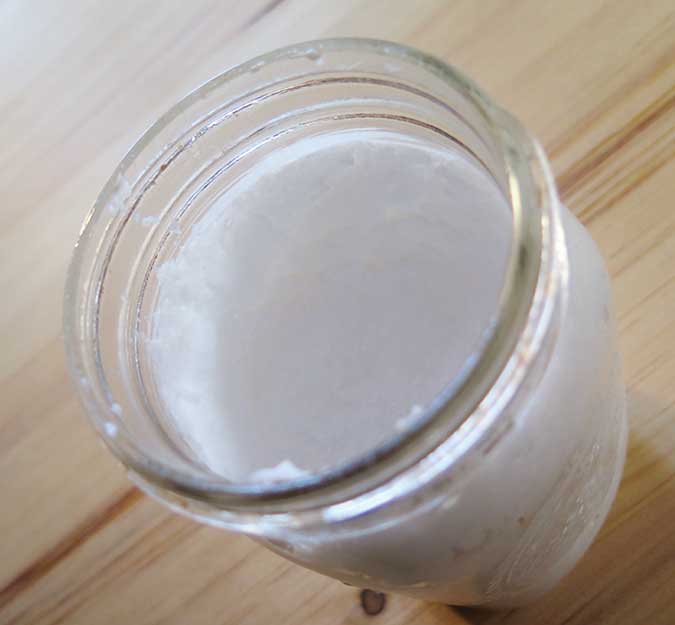 Put the solution in a jar to let it cool and set up. After a few hours, the liquid will turn an opaque white and become a bit stiff like shaving cream or mayonnaise. After 24 hours, the stuff is ready to use on furniture.
