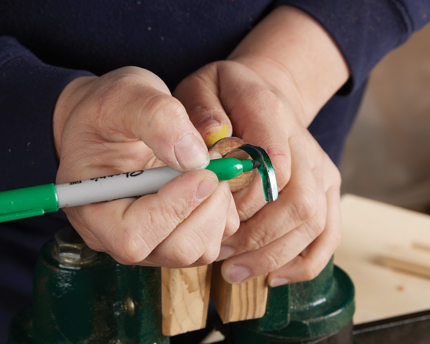 Working the outside bevel of the hook knife first, take the scrap block and gently push it from the center of the hook knife towards the outside cutting edge. Repeat this motion across the entire bevel of the hook knife until all of the marker color has disappeared. Check on the other side of the hook knife to see if you have raised a burr. If you have not raised a burr, color your bevel again, and repeat the steps until you can feel a burr. When you feel a burr, flip the hook knife around. You want to knock off the burr you just created and nothing more. To do this, take the round dowel and gently glide it along the inside of your hook knife. Feel the edge. Once the burr has disappeared, flip the hook knife around and continue the same steps through your remaining grits.