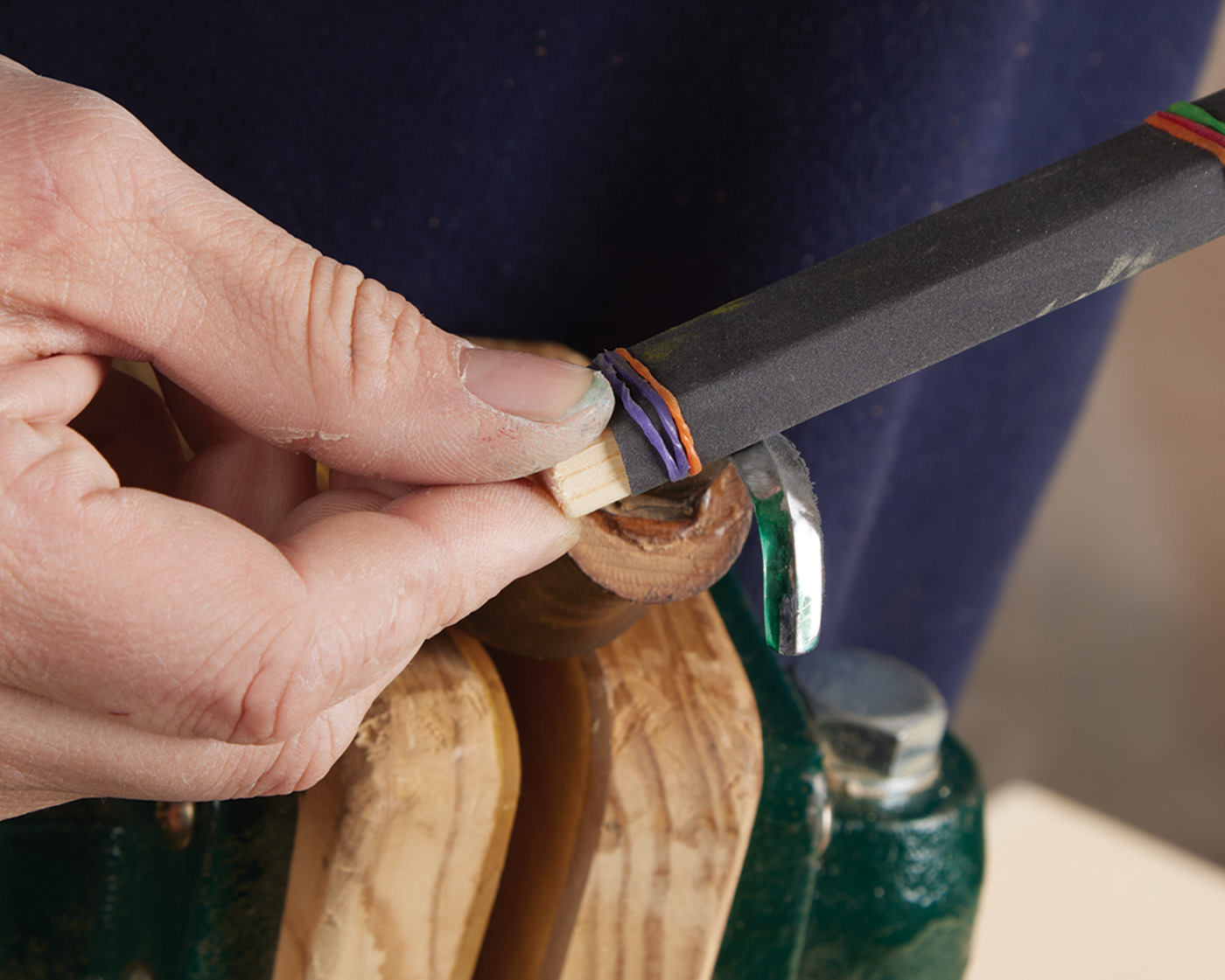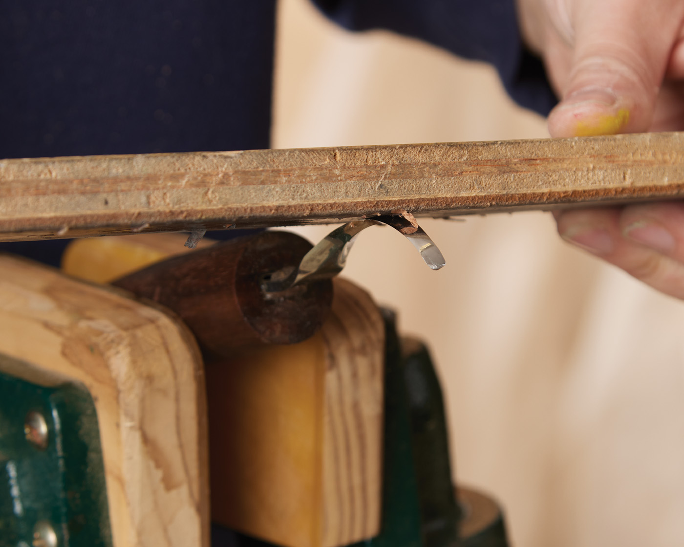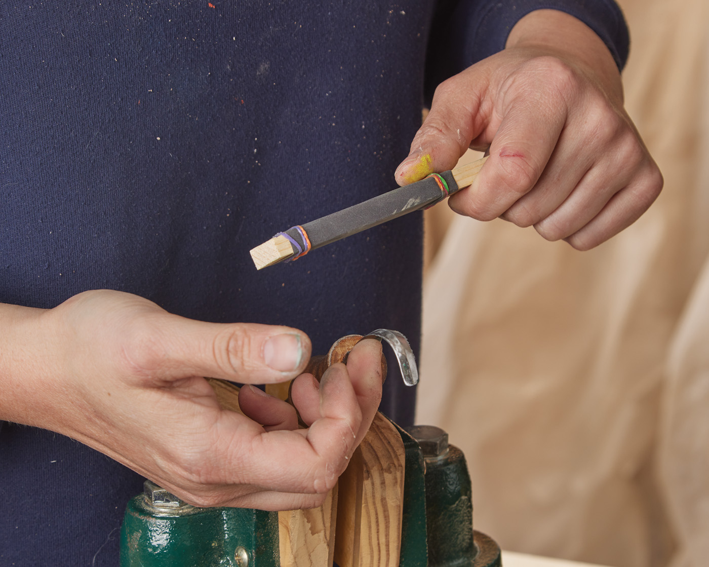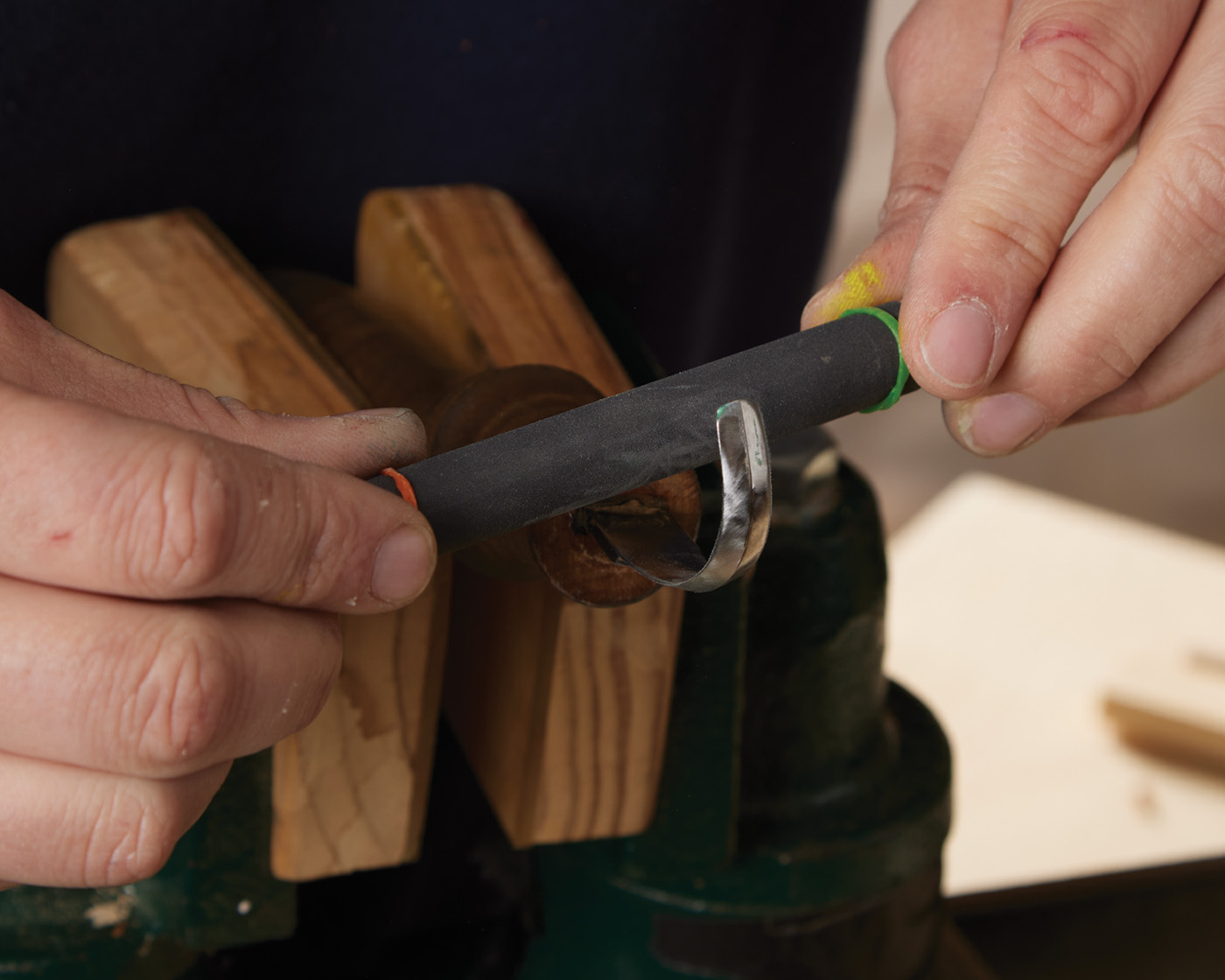 11 Use the same motion as the straight dowels to hone the outside edge of the hook knife.