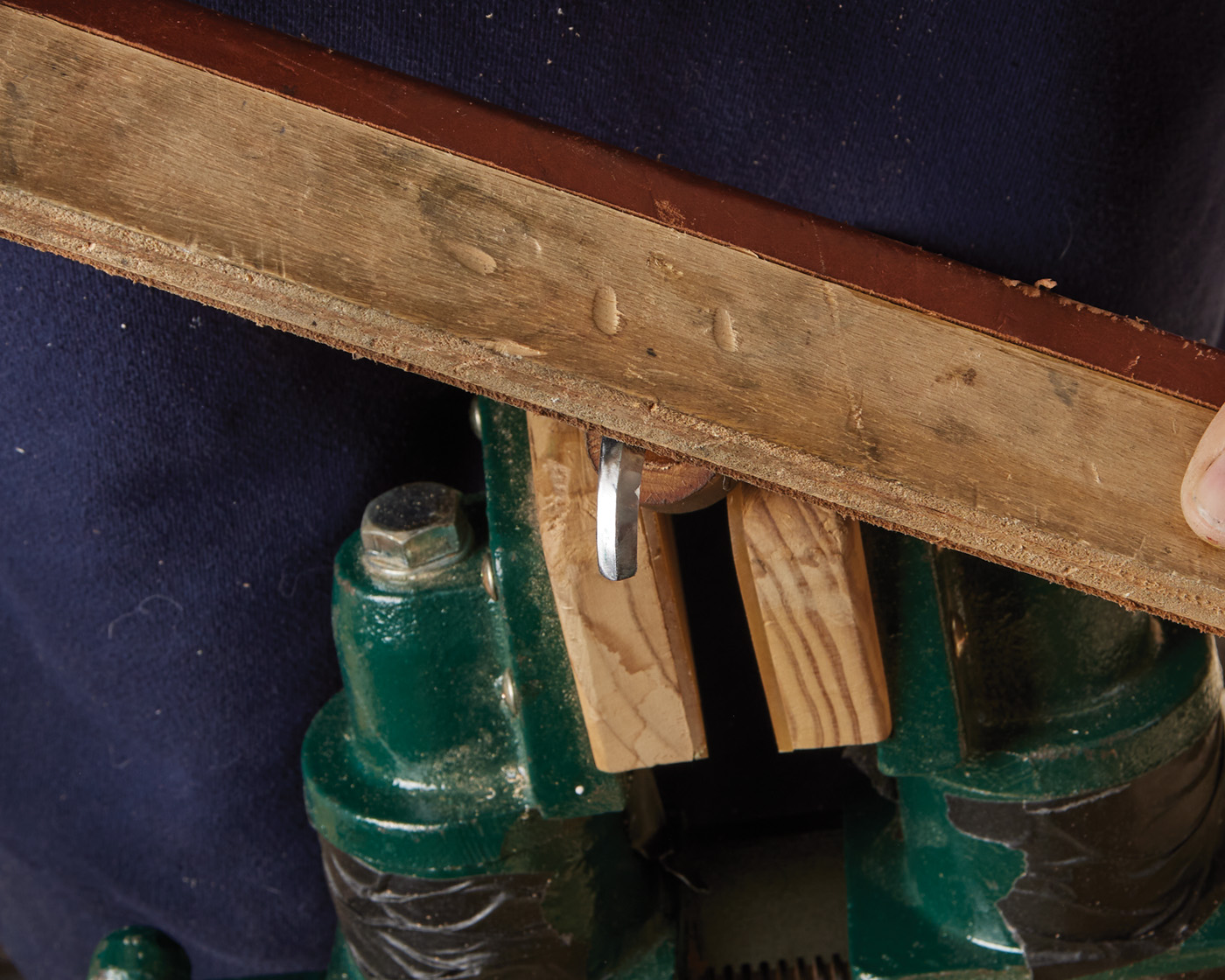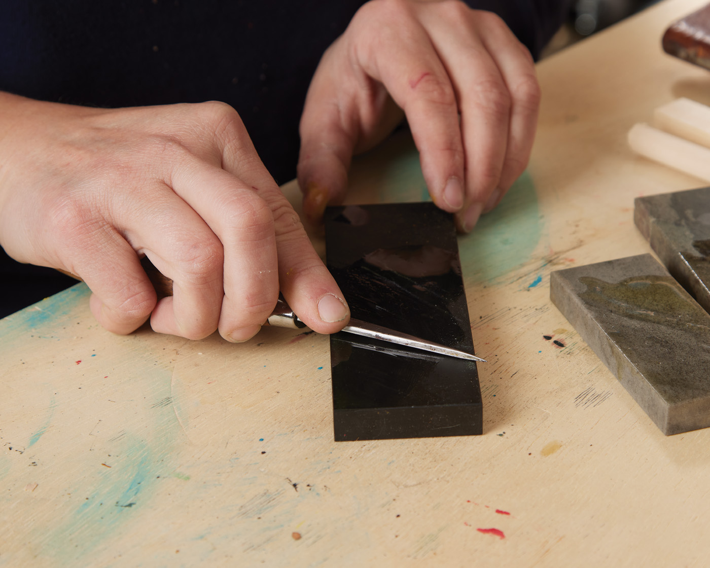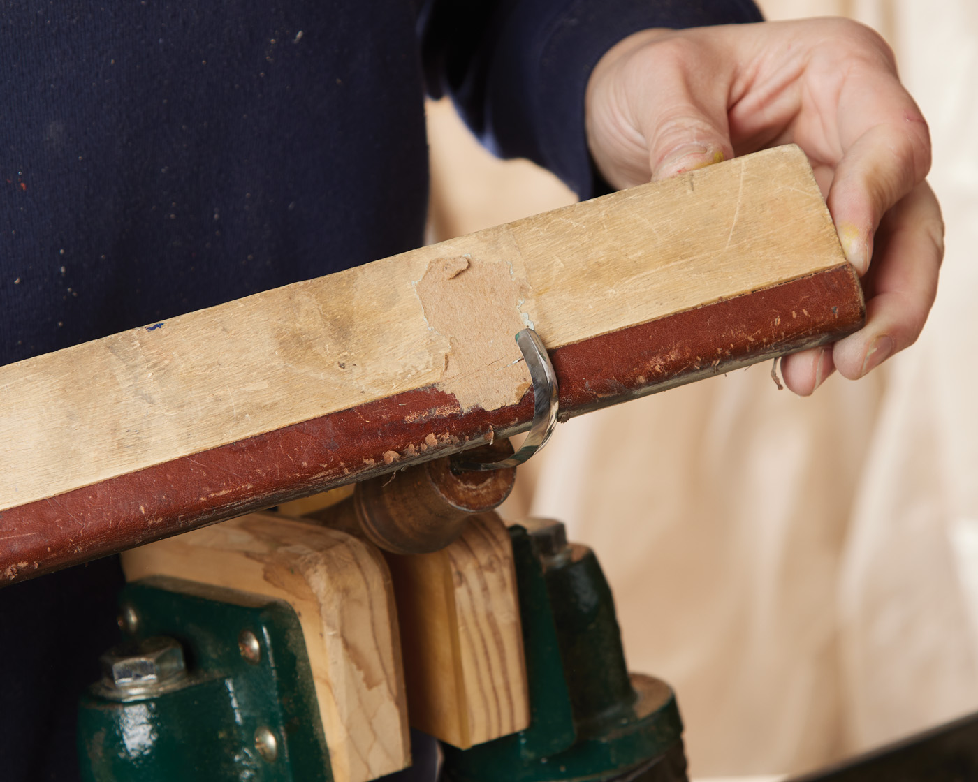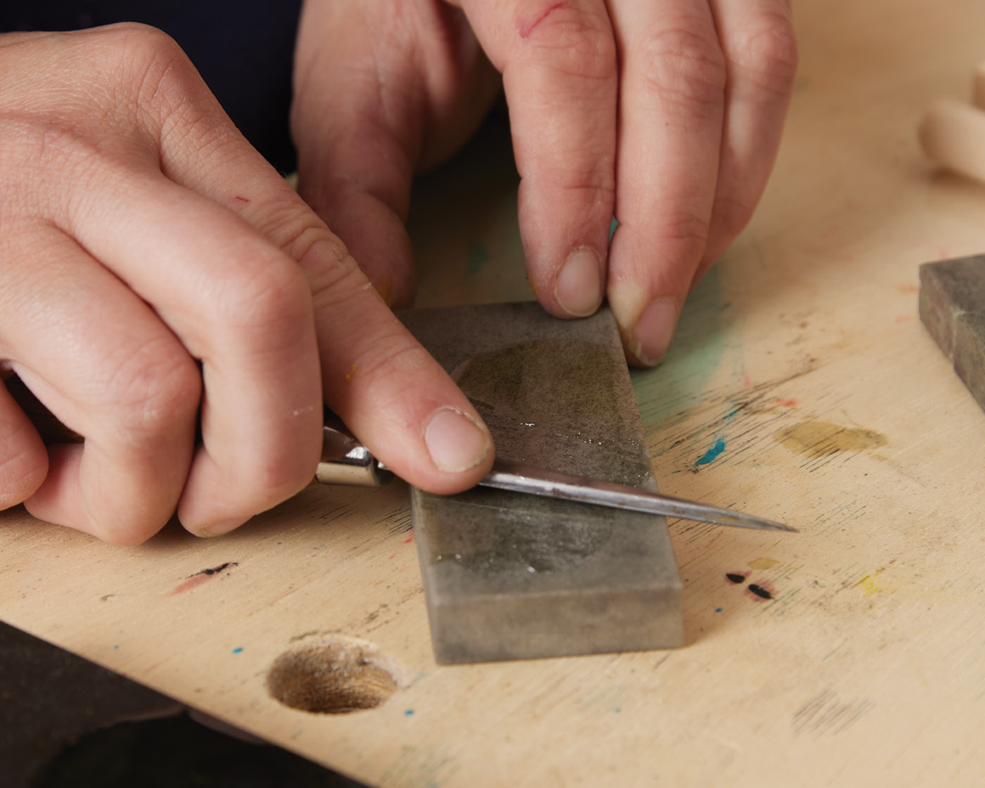 11 Use the same motion as the straight dowels to hone the outside edge of the hook knife.