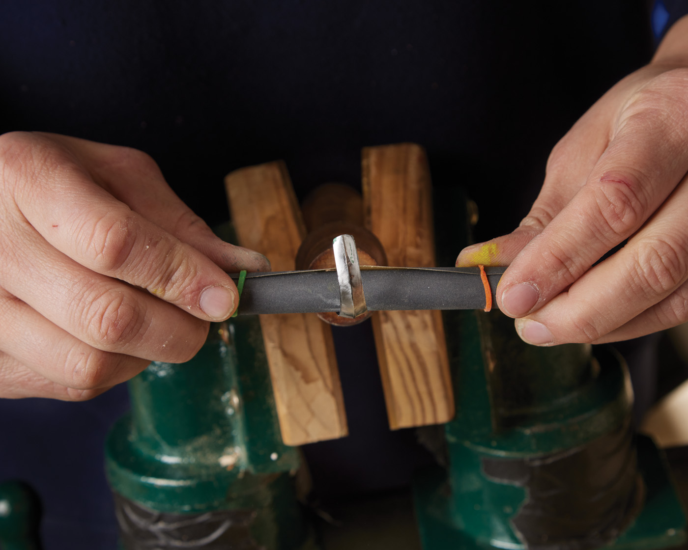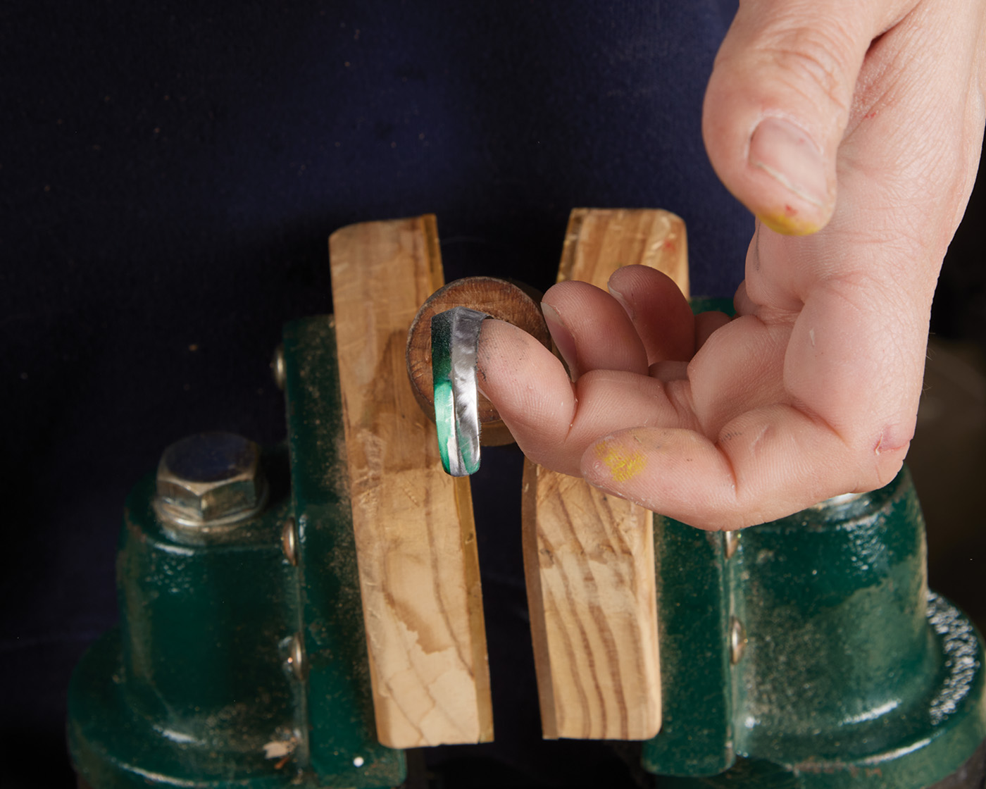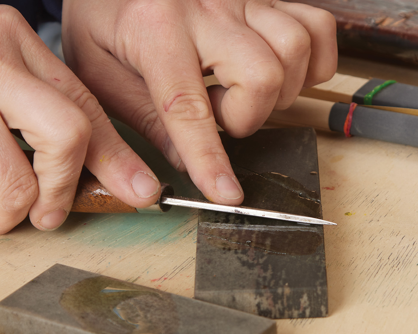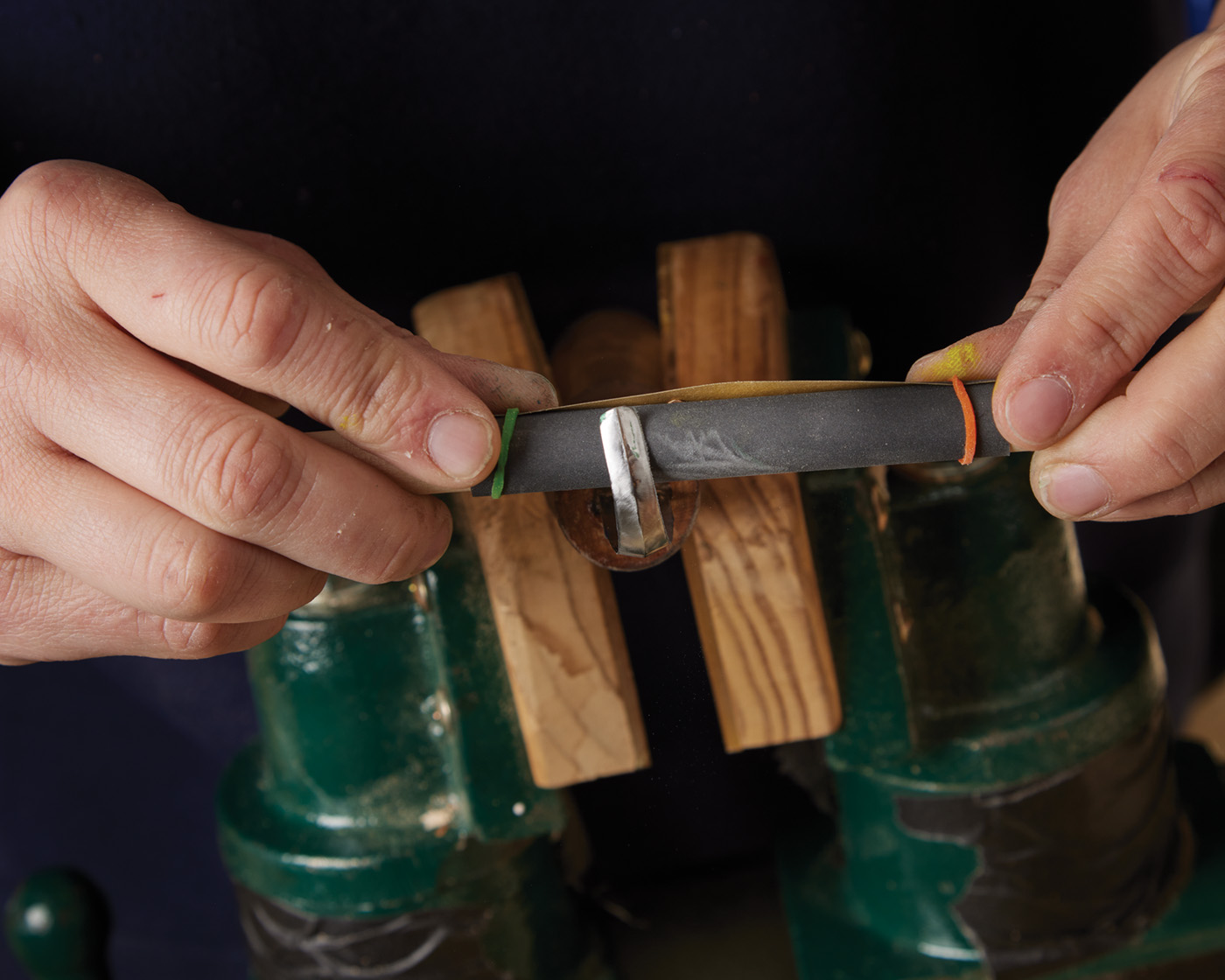 11 Use the same motion as the straight dowels to hone the outside edge of the hook knife.