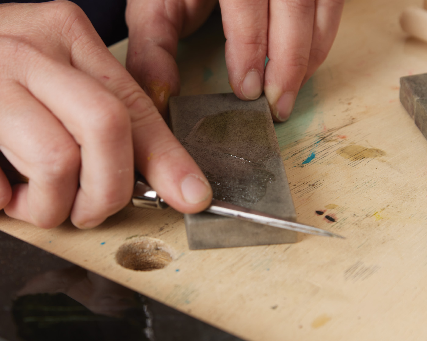 5 Drag the block, following the bevel angle, towards the outside edge of your hook knife.
