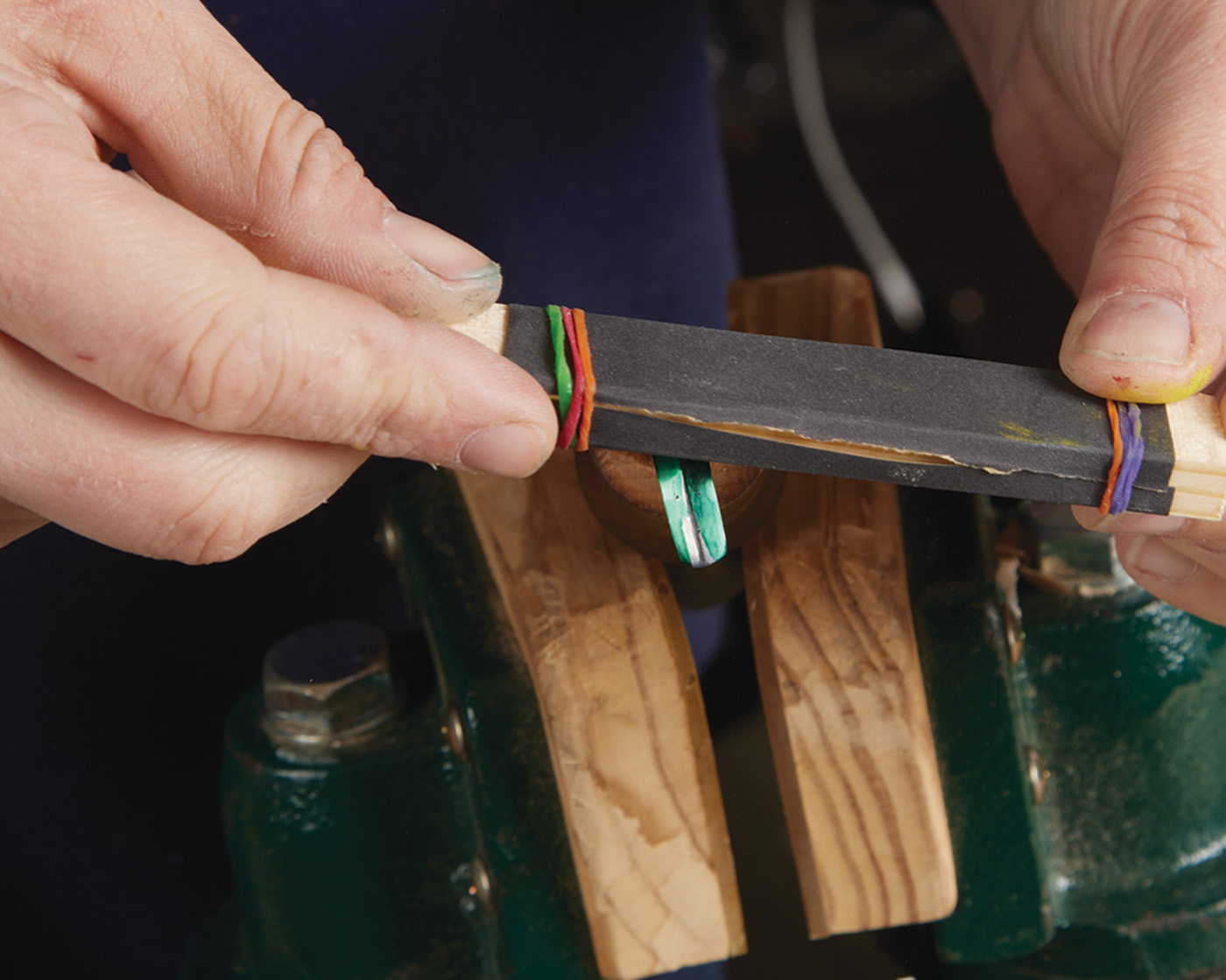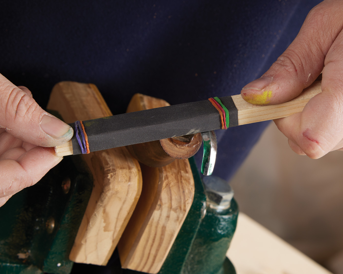 2 Use a flat scrap block wrapped with sandpaper to work the outside of your hook knife.