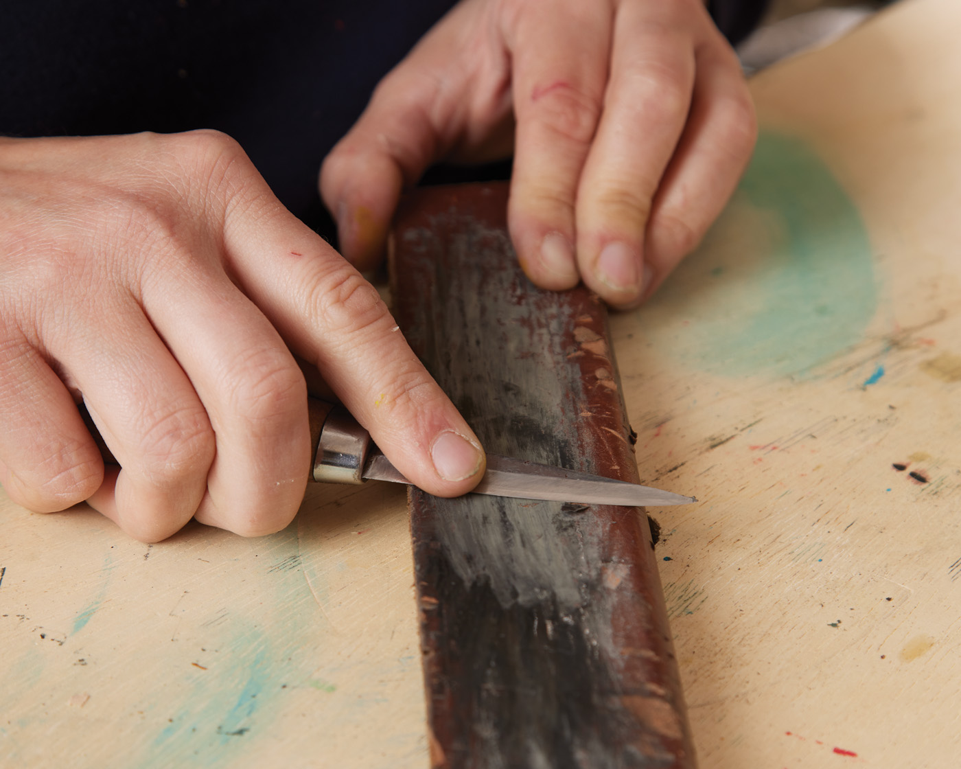 12 Apply honing compound to the rounded edge of your strop. Use the same motion as the rounded dowel to hone the inside edge of your hook knife.