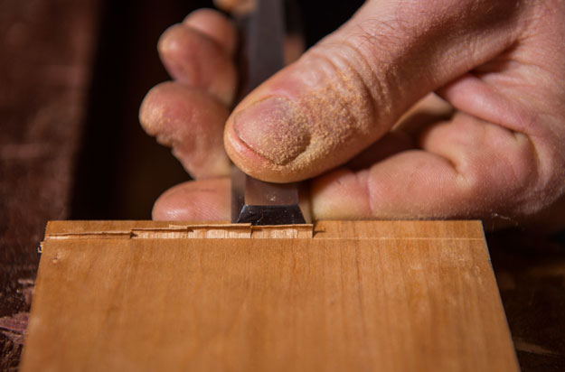 Working from both sides, remove the waste using a 3⁄8″ and a 1⁄4″ chisel, with the bevels facing up.