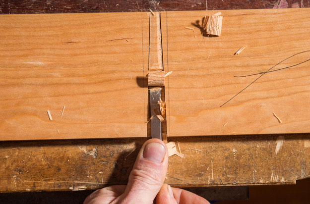 Waste removal. Work in from both sides to remove the waste. On the wider side, a 3⁄8″ chisel is the best choice; working from the narrower side, switch to a 1⁄4″-wide tool.