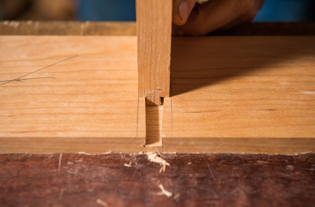 Now the moment of truth! Slide the tail into the socket and use a hammer to seat it tightly. If it’s too tight and doesn’t go all the way home, that’s a good problem. Look at both ends, and you can usually tell where the problem lies. If it’s too tight on one end, simply chisel away the material on the pin board. (If it’s too loose, start over with a fresh pin board.)