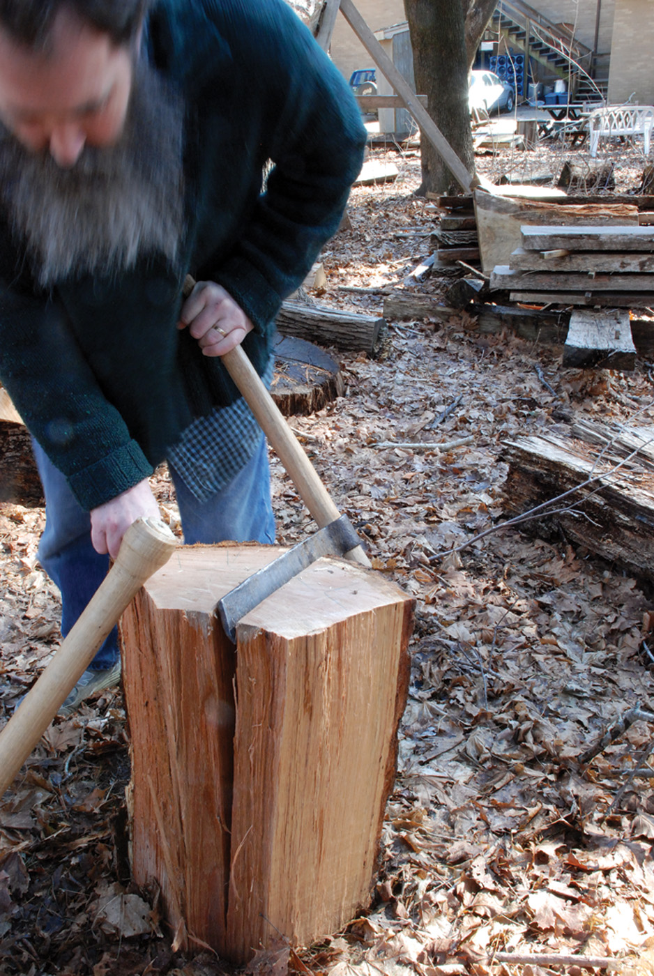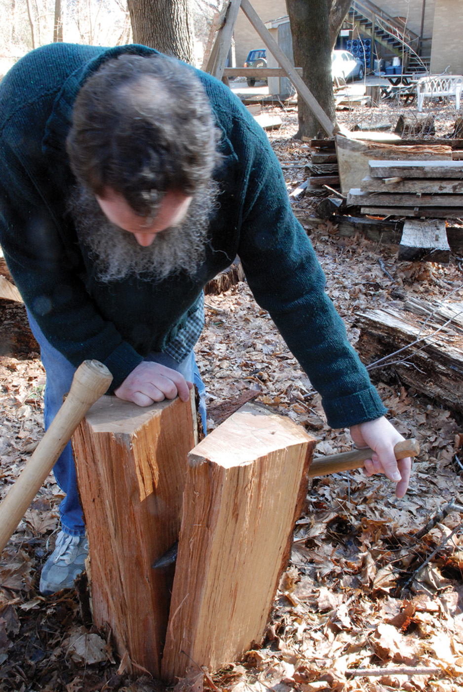 Usually by now a split has opened up enough to get a wooden wedge in place; I often locate this between the two steel wedges. As you drive this, the steel wedges come loose. Get them out of the way. Then drive the wooden wedge nearly to its head. By now a split should be running down the sides of the log. You can leapfrog the steel wedges into these side splits, and knock them in. More wooden wedges might be necessary as well. If there are fibers of wood criss-crossed inside, remove the steel wedges, drive wooden ones in to open the log up as much as possible, then get in there with a hatchet or long-handled axe and snip these fibers. Watch for the log falling open when these let go. Shins and feet are particularly at risk.