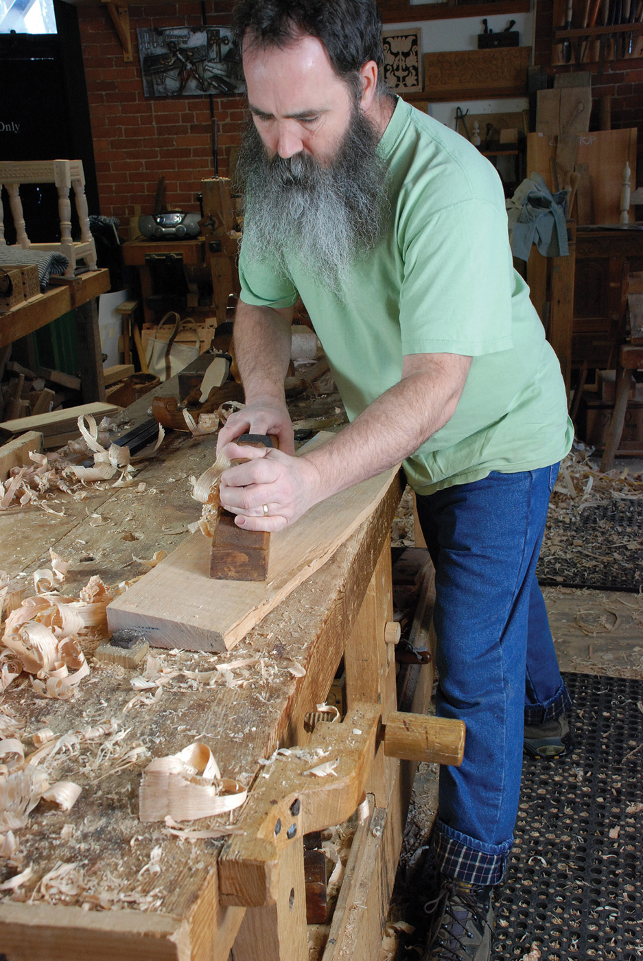 After the boards have sat for a while (roughly two to four weeks) I can then take them from the stack, and with a sharp smoothing plane, re-plane the surface. We’re just talking about a few strokes to clean up any torn, fuzzy fibers. The surface of the stock has dried enough now to take a finer finish cut with the plane; but the interior of the stock is still moist. Thus cutting is still easier than it would be on kiln-dried stuff. Now is the time to carve decoration, cut joinery, and do any turned work for the project at hand.