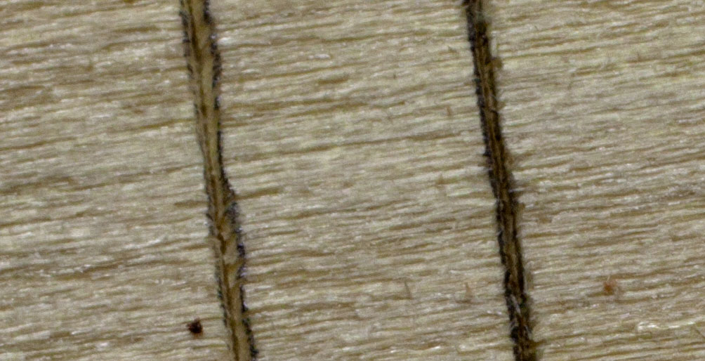 But when you deal with coarse woods such as oak, a knife line might not be enough. In fact, a knife line can look just like a grain line at times. So I use a two-part strategy: I knife in my lines, then color them with a mechanical pencil.