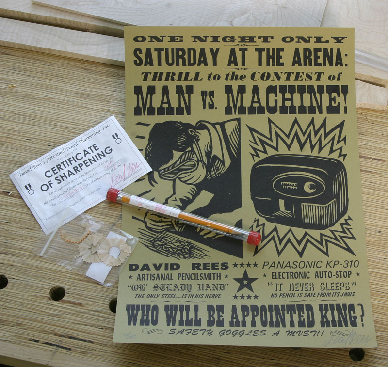 A few years ago, Christopher Schwarz stumbled across David Rees’s “Artisanal Pencil Sharpening” site. For $15, Rees sends a sharpened pencil in a plastic tube with a protective tip over the hand-sharpened point, along with a certificate of authenticity and the bagged pencil shavings. Plus, at the time, for $50 your order would include a limited-edition print on acid-free paper, signed and numbered by the artist (the prints are now sold out).