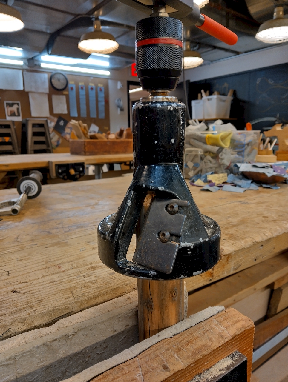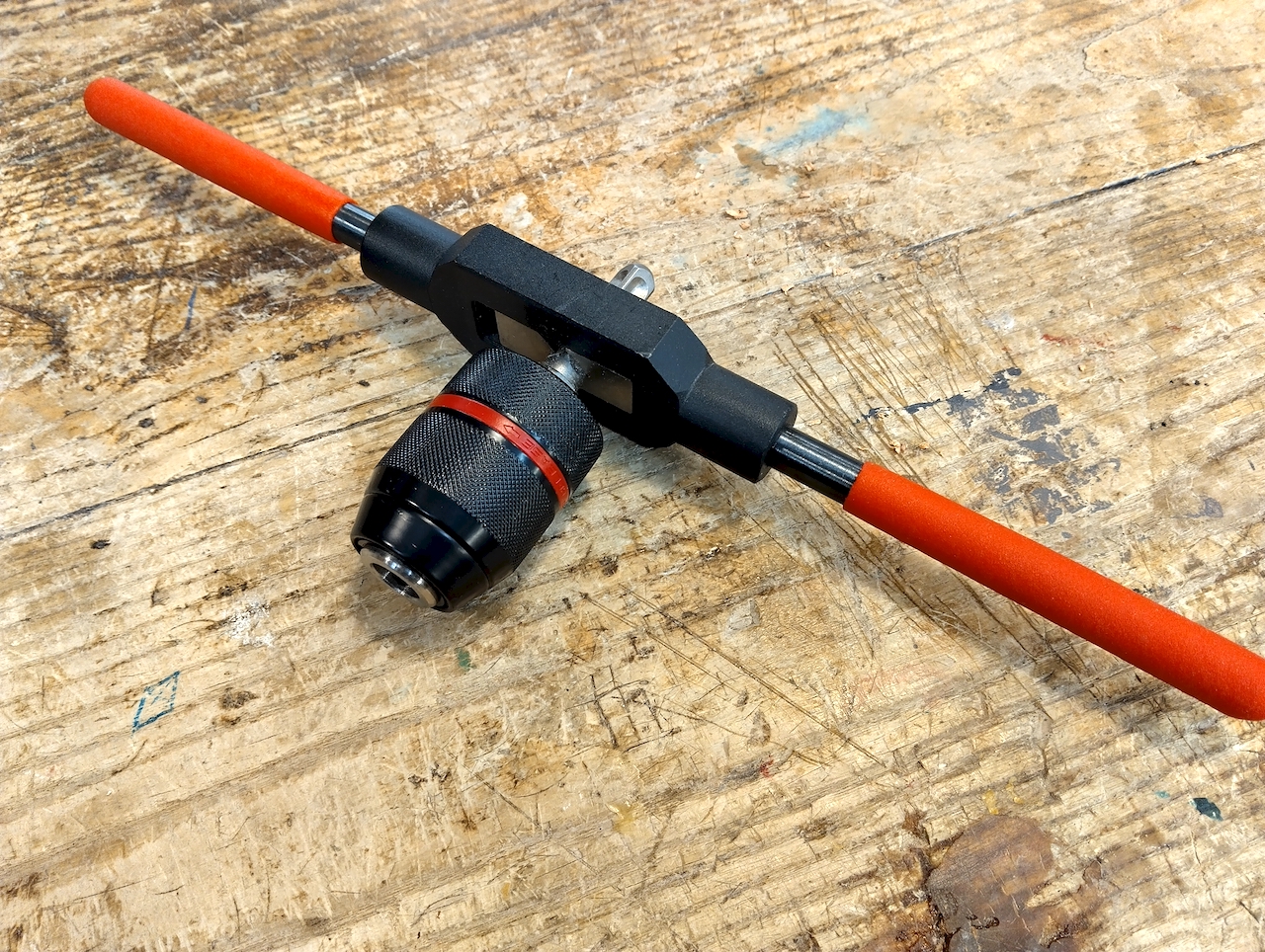My solution involves a pairing of two off-the-shelf tools: a tap handle and a keyless chuck, combined with a specialized Drill Chuck Adapter. This adapter is particularly robust, featuring a square tang at the end—a much more substantial connection than the standard SDS Plus shank. After screwing the adapter into the back of the keyless chuck, I secure it tightly using a small, provided retaining screw (threaded from the interior of the chuck to prevent the adapter from unscrewing), ensuring zero slip. The tap handle then grips this square end, giving students a wide radius to apply the necessary force for controlled drilling. In essence, I created a versatile auger handle with a chuck that can be opened or closed over various drilling tools.