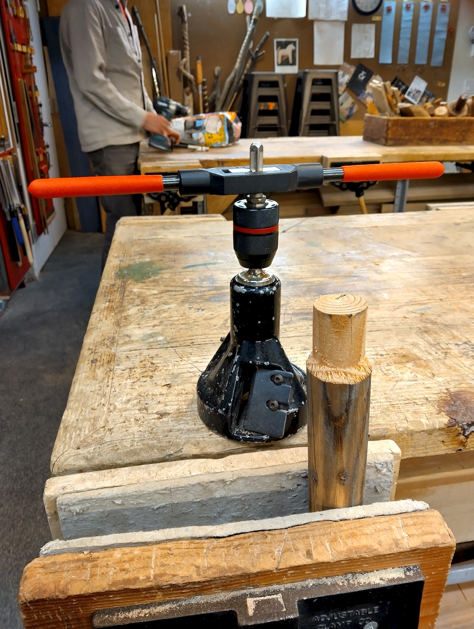 If you recall, a few years ago I wrote about the method I use to teach my students how to drill wide holes—around 1-3/8 inches or even wider—at the base of a stool seat to anchor the legs. Since the augers we rely on have a hexagonal shank, I needed a simple, effective tool to enable hand-powered drilling.